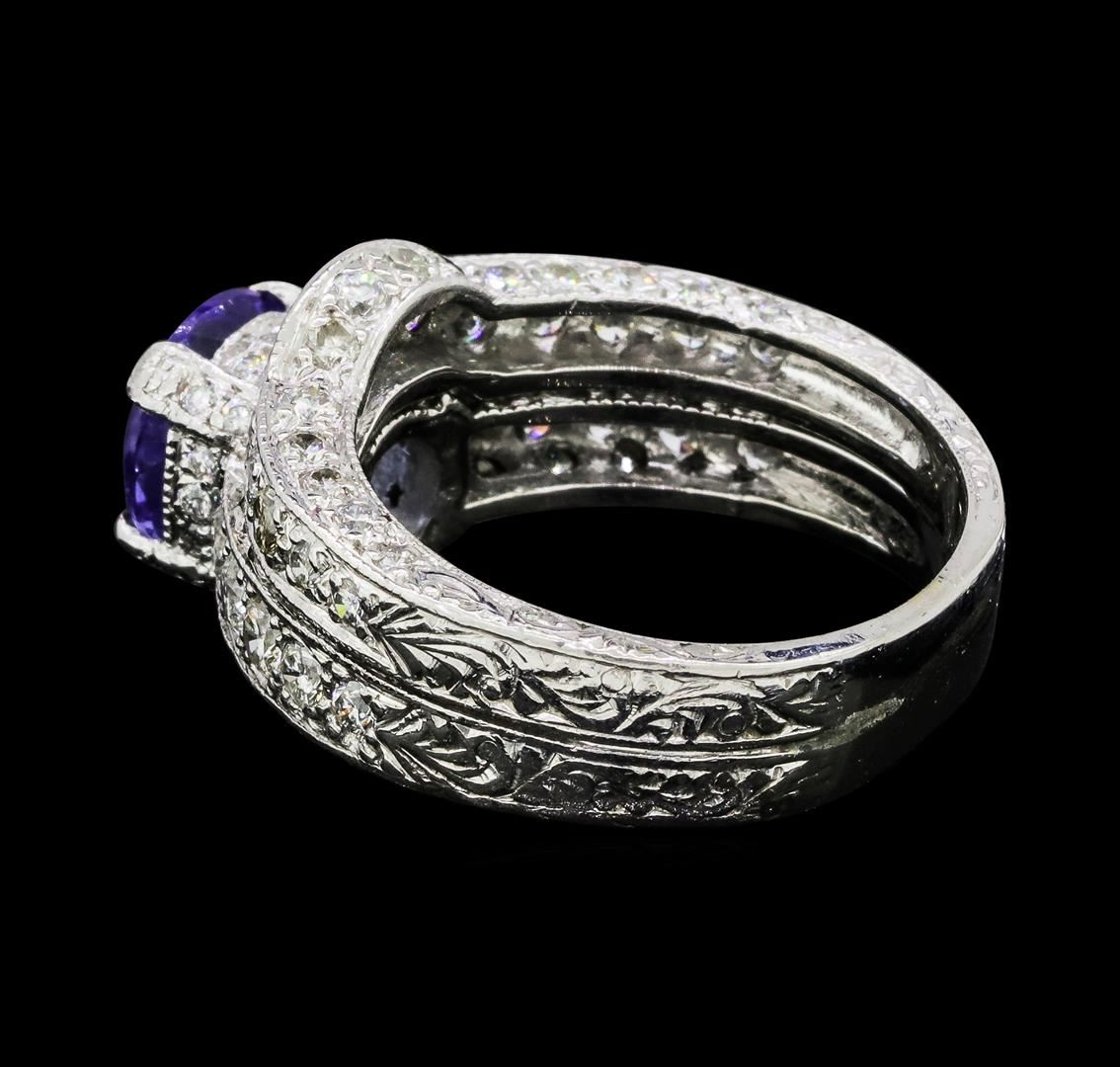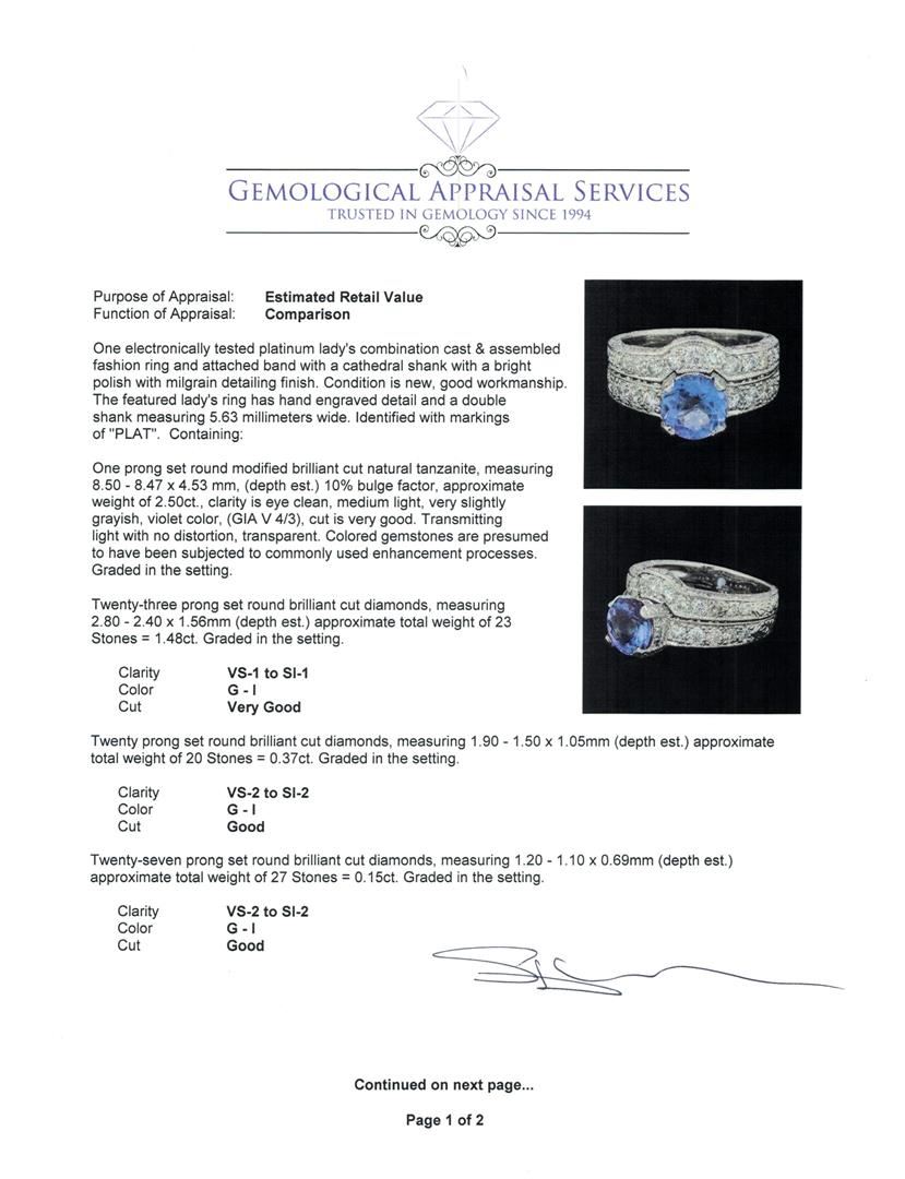 One electronically tested platinum lady's combination cast & assembled fashion ring and attached band with a cathedral shank with a bright polish with milgrain detailing finish. The featured lady's ring has hand engraved detail and a double shank measuring 5.63 millimeters wide. Identified with markings of 'PLAT'. Condition is new, good workmanship. Containing: One prong set round modified brilliant cut natural tanzanite, measuring 8.50 - 8.47 x 4.53 mm, (depth est.) 10%. bulge factor, approximate weight of 2.50ct., clarity is eye clean, medium light, very slightly grayish, violet color, (GIA V 4/3), cut is very good. Transmitting light with no distortion, transparent. Colored gemstones are presumed to have been subjected to commonly used enhancement processes. Graded in the setting. Twenty-Three prong set round brilliant cut diamonds, measuring 2.80 - 2.40 x 1.56mm (depth est.) approximate total weight of 23 Stones = 1.48ct. Graded in the setting. Color G - I Clarity VS-1 to SI-1 Cut Very Good Twenty prong set round brilliant cut diamonds, measuring 1.90 - 1.50 x 1.05mm (depth est.) approximate total weight of 20 Stones = 0.37ct. Graded in the setting. Color G - I Clarity VS-2 to SI-2 Cut Good Twenty-Seven prong set round brilliant cut diamonds, measuring 1.20 - 1.10 x 0.69mm (depth est.) approximate total weight of 27 Stones = 0.15ct. Graded in the setting. Color G - I Clarity VS-2 to SI-2 Cut Good. Total Weight of Colored Stones 2.50ct.. Total Weight of Diamonds 2.00ct.. Total Weight of Ring And Attached Band 15.60gm GAS Appraised at $9540.00. GAS Appraised at $9,540.00.