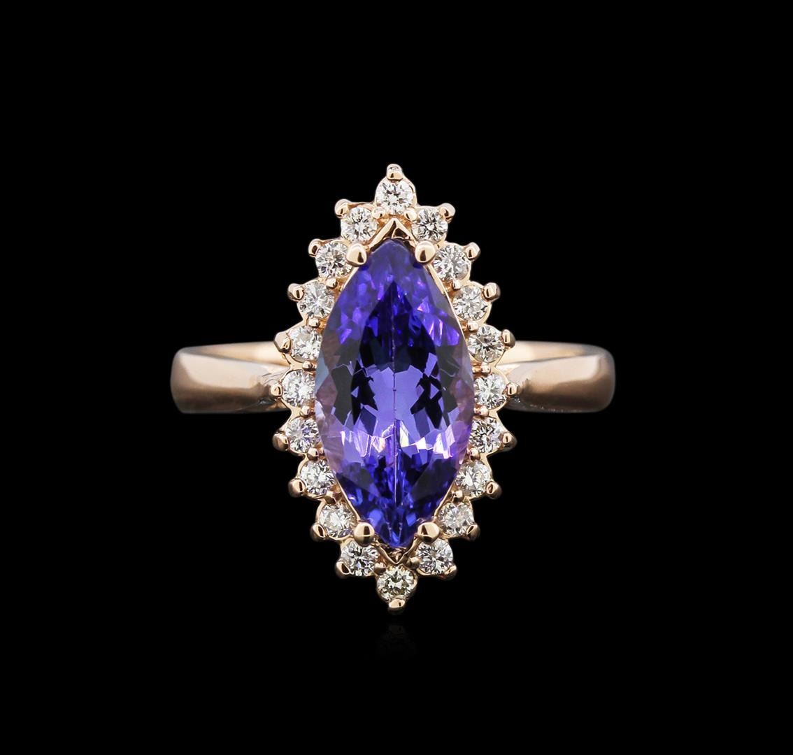 One stamped & tested 14KT rose gold lady's cast cocktail ring with a cathedral shank with a bright polish finish. Condition is new. Containing: One prong set marquise modified brilliant cut natural tanzanite, measuring 13.00 x 6.80 x 4.50mm, approximate weight of 2.50 ct., clarity is eye clean, type I, medium, very slightly grayish, bluish violet color, (GIA bV 5/3), cut is good. Colored gemstones are presumed to have been subjected to commonly used enhancement processes. Graded in setting. Twenty prong set round brilliant cut diamonds, measuring 1.50 - 1.45 x 0.96mm (depth est.) approximate total weight of 20 Stones = 0.30 ct. Graded in setting. Clarity: SI-1 to SI-2. Color: H - I. Cut: Good. Total Weight of Colored Stones: 2.50 ct. Total Weight of Diamonds: 0.30 ct. Total Weight of Ring: 5.30 gm. GAS Appraised.