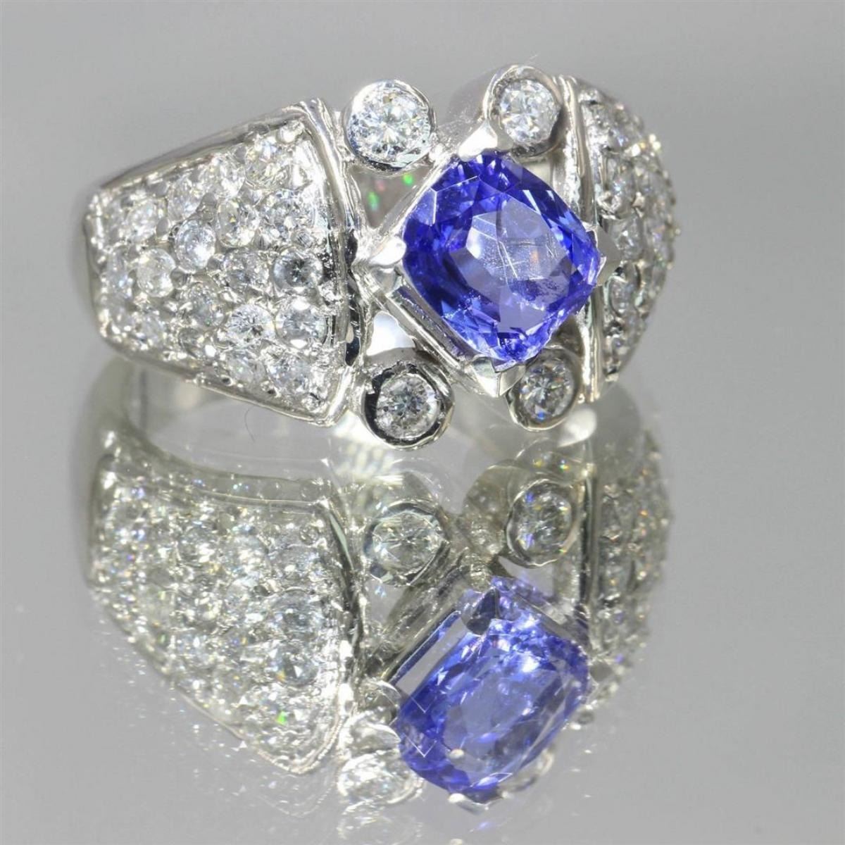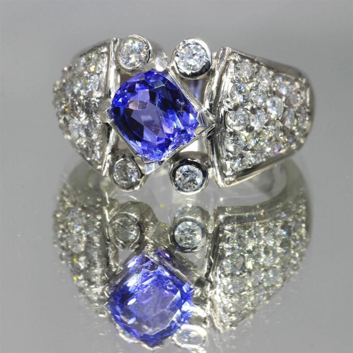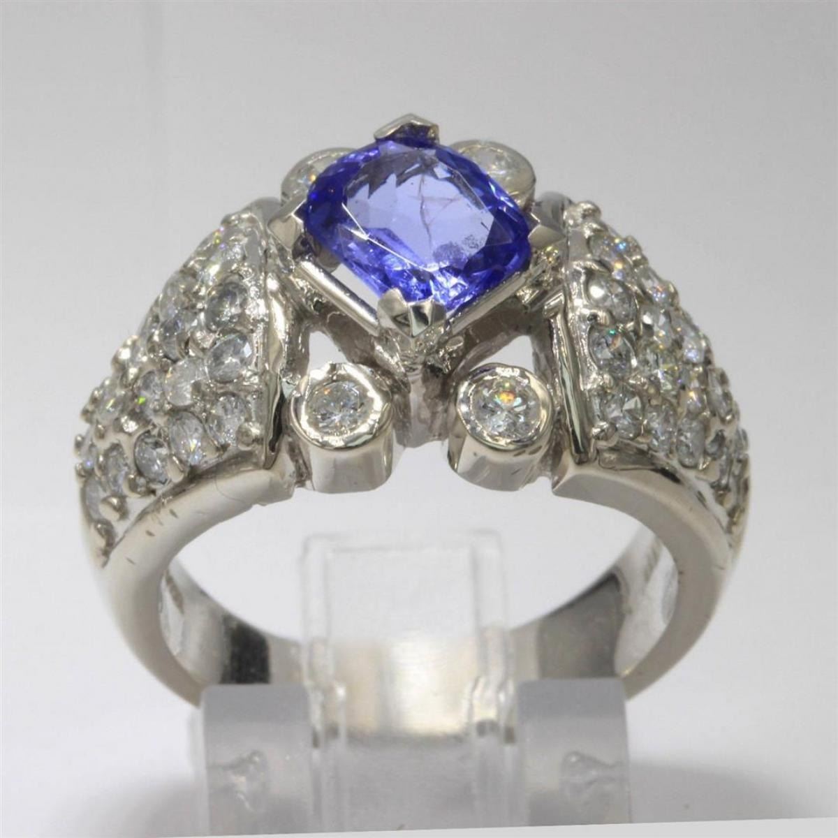 One engagement ring featuring: 14KT white gold weighing 9.23 grams containing one tanzanite weighing 1.35ct and diamonds weighing 1.115ctw. The tanzanite is purple-blue color and AAA grade. The diamonds are round brilliant cut with SI1-SI2 clarity and G-H color. The ring is a size 7.25 but is resizable.