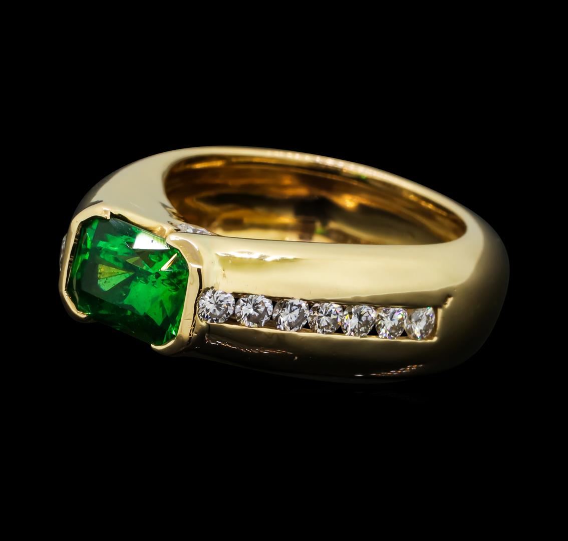 One electronically tested 14KT yellow gold lady's cast fashion ring with a European shank with a bright polish finish. The featured lady's ring has a shank measuring 8.15 millimeters wide. Identified with markings of '14K'. Condition is like new, good workmanship. Containing: One half bezel set emerald modified brilliant cut natural tsavorite garnet, measuring 8.10 x 5.70 x 5.30mm, (depth est.) 5%. bulge factor, approximate weight of 2.50ct., clarity is eye clean, dark, strong, green color, (GIA G 7/5), cut is very good. The featured stone has minute abrasions on the crown and table. Transmitting light with no distortion, transparent. Colored gemstones are presumed to have been subjected to commonly used enhancement processes. Graded in the setting. Sixteen channel set round brilliant cut diamonds, measuring 2.30 - 2.25 x 1.41mm (depth est.) approximate total weight of 16 Stones = 0.75ct. Graded in the setting. Clarity VS-1 to VS-2. Color: G - H Cut Very Good. Total Weight of Colored Stones 2.50ct.. Total Weight of Diamonds 0.75ct.. Total Weight of Ring 12.00gm GAS Appraised at $6,790.00.