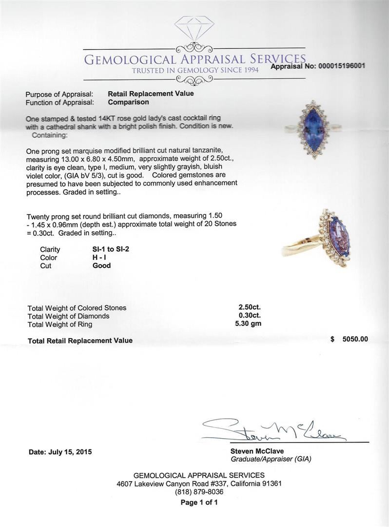One stamped & tested 14KT rose gold lady's cast cocktail ring with a cathedral shank with a bright polish finish. Condition is new. Containing: One prong set marquise modified brilliant cut natural tanzanite, measuring 13.00 x 6.80 x 4.50mm, approximate weight of 2.50ct., clarity is eye clean, type I, medium, very slightly grayish, bluish violet color, (GIA bV 5/3), cut is good. Colored gemstones are presumed to have been subjected to commonly used enhancement processes. Graded in setting. Twenty prong set round brilliant cut diamonds, measuring 1.50 - 1.45 x 0.96mm (depth est.) approximate total weight of 20 Stones = 0.30ct. Graded in setting. Clarity: SI-1 to SI-2. Color: H - I. Cut: Good. Total Weight of Colored Stones: 2.50ct. Total Weight of Diamonds: 0.30ct. Total Weight of Ring: 5.30 gm. GAS Appraised at $5,050.00.