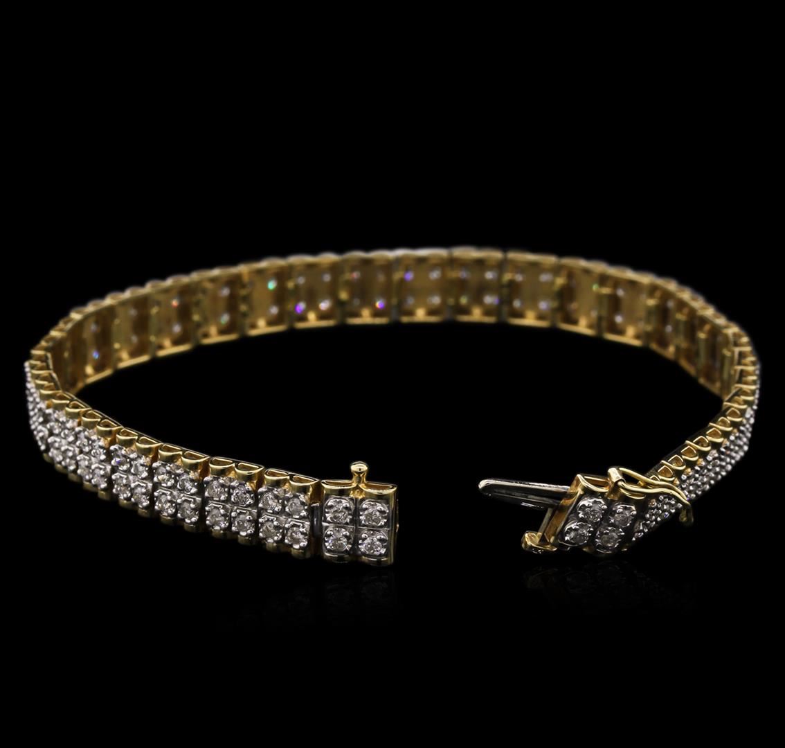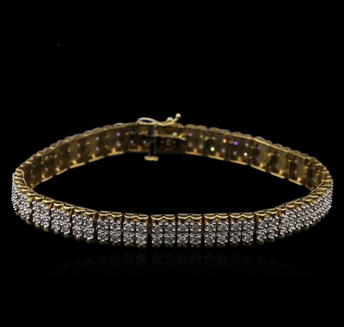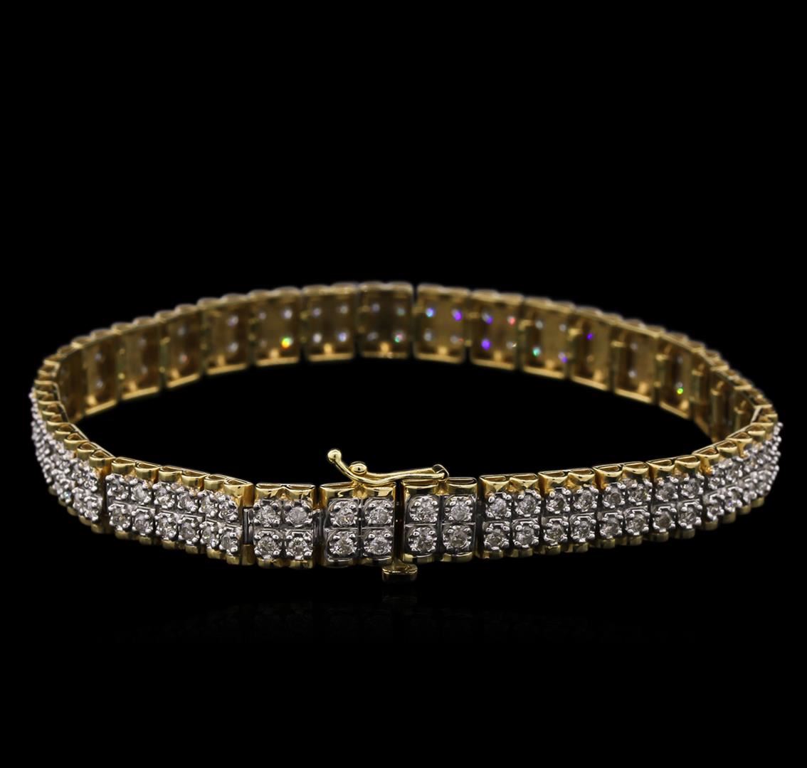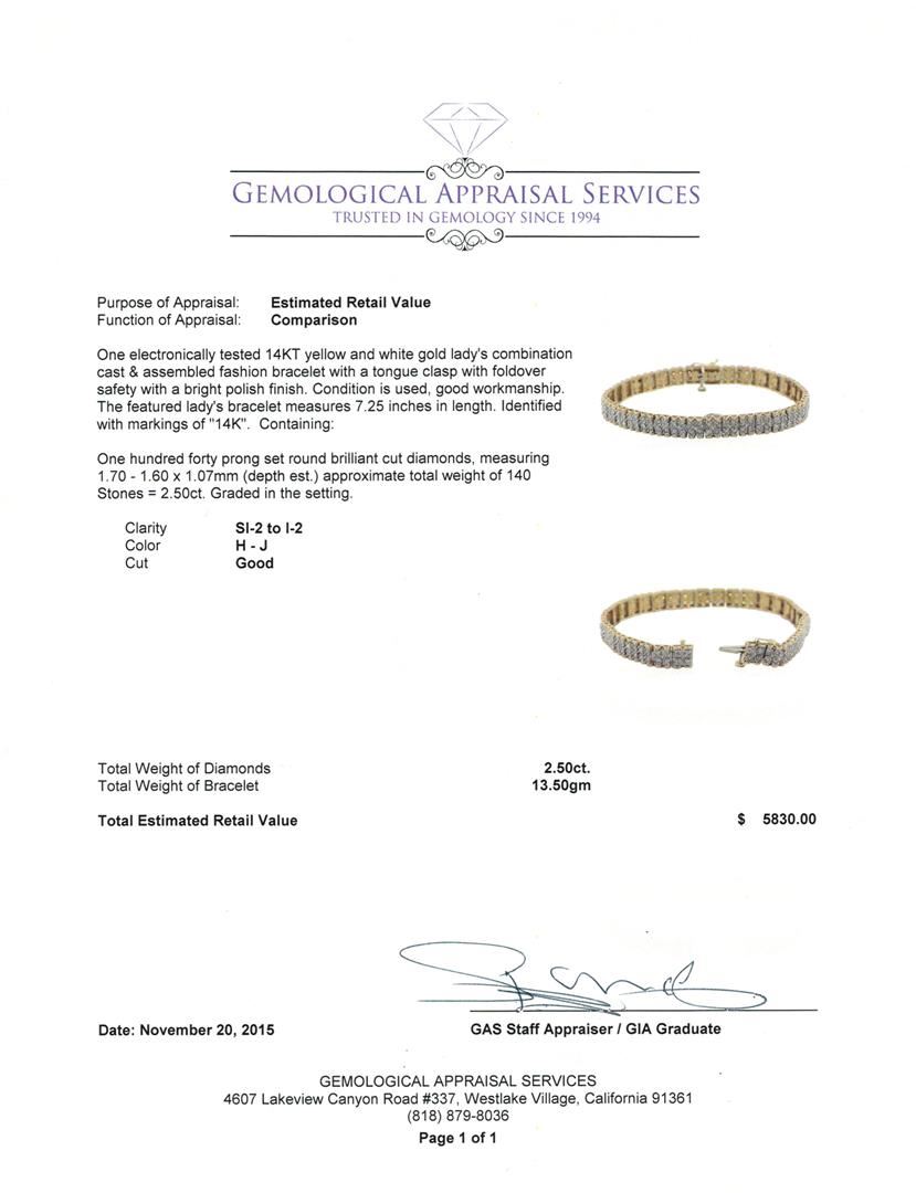 One electronically tested 14KT yellow and white gold lady's combination cast & assembled fashion bracelet with a tongue clasp with foldover safety with a bright polish finish. The featured lady's bracelet measures 7.25 inches in length. Identified with markings of "14K". Condition is used, good workmanship. Containing: One Hundred Forty prong set round brilliant cut diamonds, measuring 1.70 - 1.60 x 1.07mm (depth est.) approximate total weight of 140 Stones = 2.50ct. Graded in the setting. Clarity: SI-2 to I-2. Color: H - Good. Total Weight of Diamonds 2.50ct. Total Weight of Bracelet 13.50gm. GAS Appraised at $5,830.00.