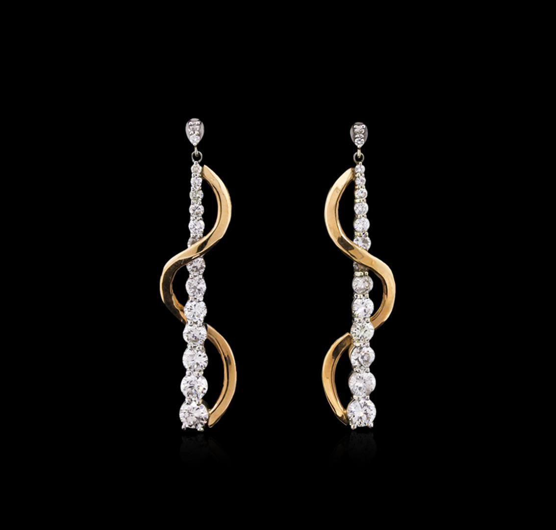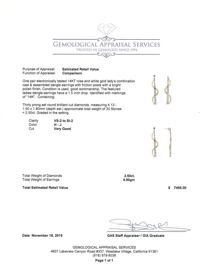 One pair electronically tested 14KT rose and white gold lady's combination cast & assembled dangle earrings with friction posts with a bright polish finish. The featured ladies dangle earrings have a 1.5 inch drop. Identified with markings of "14K". Condition is used, good workmanship. Containing: Thirty prong set round brilliant cut diamonds, measuring 4.13 - 1.50 x 1.80mm (depth est.) approximate. Total Weight of 30 Stones = 2.50ct. Graded in the setting. Clarity: VS-2 to SI-2. Color: H - Very Good. Total Weight of Diamonds 2.50ct. Total Weight of Earrings 4.90gm. GAS Appraised.