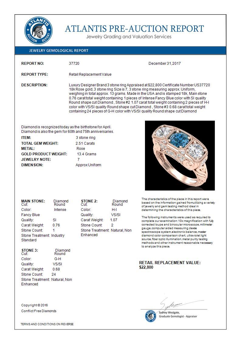 REF-345W5F -37720 ---- 2.51 CTW Intense Blue Diamond Solitaire Art Deco 3 Stone Ring 18K Rose Gold ---- Luxury Designer Brand 3 stone ring Appraised at $22,800 Certificate Number US37720 18k Rose gold, 3 stone ring Size is 7, 3 stone ring measuring approx. Uniform, weighing in total approx. 13 grams. Made in the USA and is stamped 18k, Main stone 0.76 carat total weight containing 1 pieces of Intense Fancy Blue color with SI quality Round shape cut Diamond , Stone #2 1.07 carat total weight containing 2 pieces of H-I color with VS/SI quality Round shape cut Diamond , Stone #3 0.68 carat total weight containing 24 pieces of G-H color with VS/SI quality Round shape cut Diamond