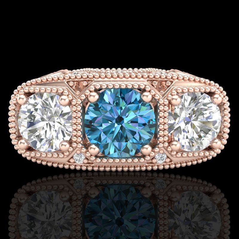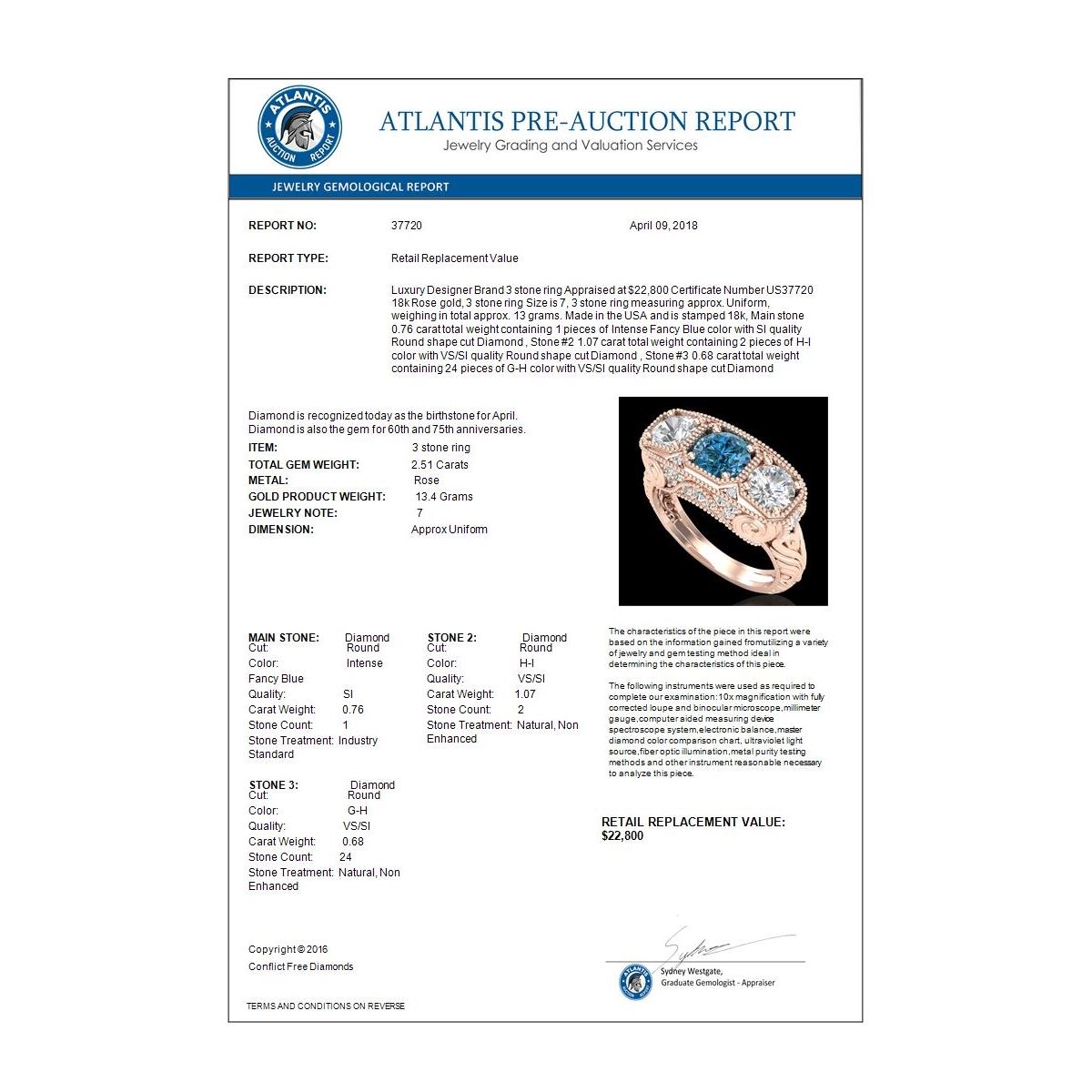 REF-345W5F -37720 ---- 2.51 CTW Intense Blue Diamond Solitaire Art Deco 3 Stone Ring 18K Rose Gold ---- Luxury Designer Brand 3 stone ring Appraised at $22,800 Certificate Number US37720 18k Rose gold, 3 stone ring Size is 7, 3 stone ring measuring approx. Uniform, weighing in total approx. 13 grams. Made in the USA and is stamped 18k, Main stone 0.76 carat total weight containing 1 pieces of Intense Fancy Blue color with SI quality Round shape cut Diamond , Stone #2 1.07 carat total weight containing 2 pieces of H-I color with VS/SI quality Round shape cut Diamond , Stone #3 0.68 carat total weight containing 24 pieces of G-H color with VS/SI quality Round shape cut Diamond