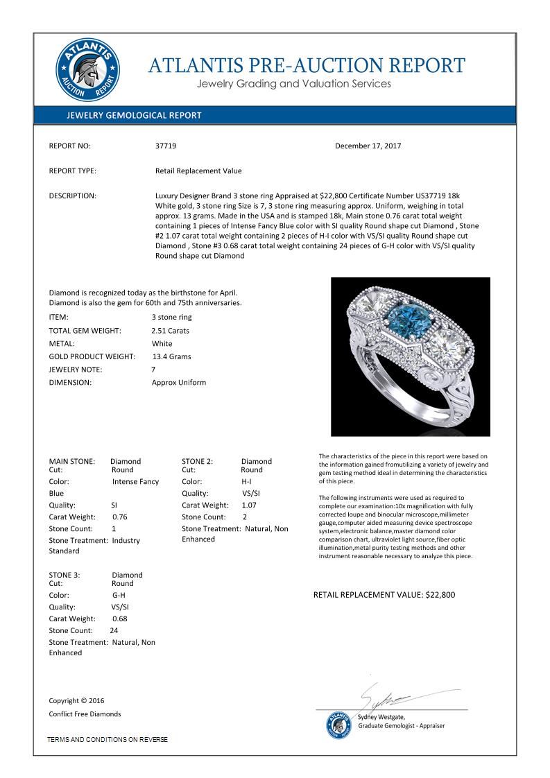 REF-345Y5K -37719 ---- 2.51 CTW Intense Blue Diamond Solitaire Art Deco 3 Stone Ring 18K White Gold ---- Luxury Designer Brand 3 stone ring Appraised at $22,800 Certificate Number US37719 18k White gold, 3 stone ring Size is 7, 3 stone ring measuring approx. Uniform, weighing in total approx. 13 grams. Made in the USA and is stamped 18k, Main stone 0.76 carat total weight containing 1 pieces of Intense Fancy Blue color with SI quality Round shape cut Diamond , Stone #2 1.07 carat total weight containing 2 pieces of H-I color with VS/SI quality Round shape cut Diamond , Stone #3 0.68 carat total weight containing 24 pieces of G-H color with VS/SI quality Round shape cut Diamond