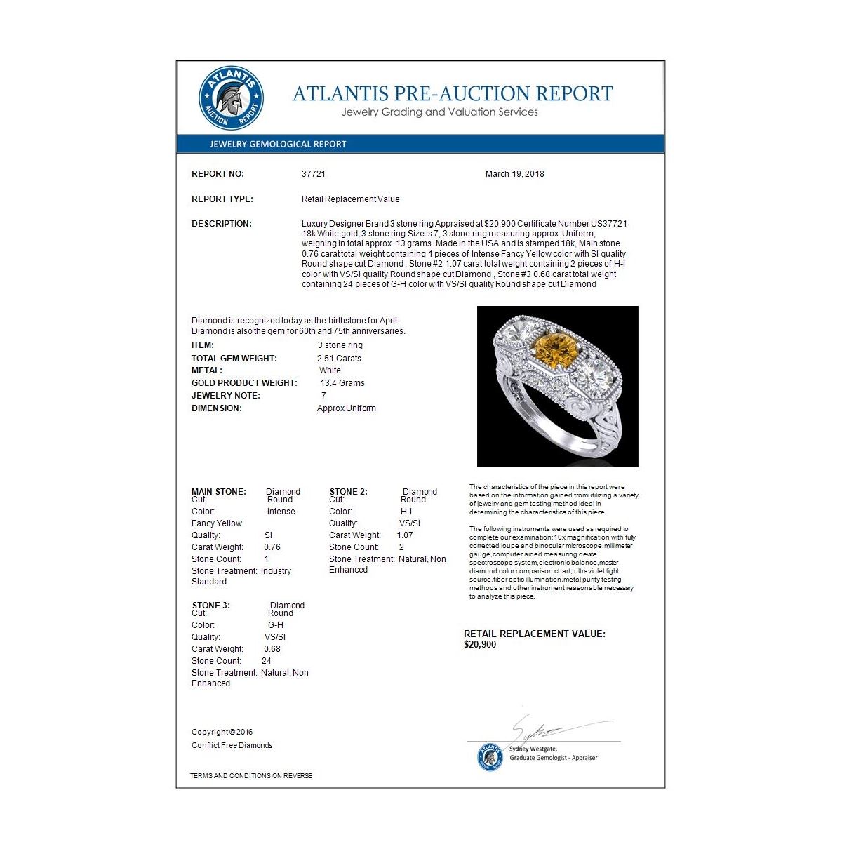 REF-345A5X -37721 ---- 2.51 CTW Intense Fancy Yellow Diamond Art Deco 3 Stone Ring 18K White Gold ---- Luxury Designer Brand 3 stone ring Appraised at $20,900 Certificate Number US37721 18k White gold, 3 stone ring Size is 7, 3 stone ring measuring approx. Uniform, weighing in total approx. 13 grams. Made in the USA and is stamped 18k, Main stone 0.76 carat total weight containing 1 pieces of Intense Fancy Yellow color with SI quality Round shape cut Diamond , Stone #2 1.07 carat total weight containing 2 pieces of H-I color with VS/SI quality Round shape cut Diamond , Stone #3 0.68 carat total weight containing 24 pieces of G-H color with VS/SI quality Round shape cut Diamond