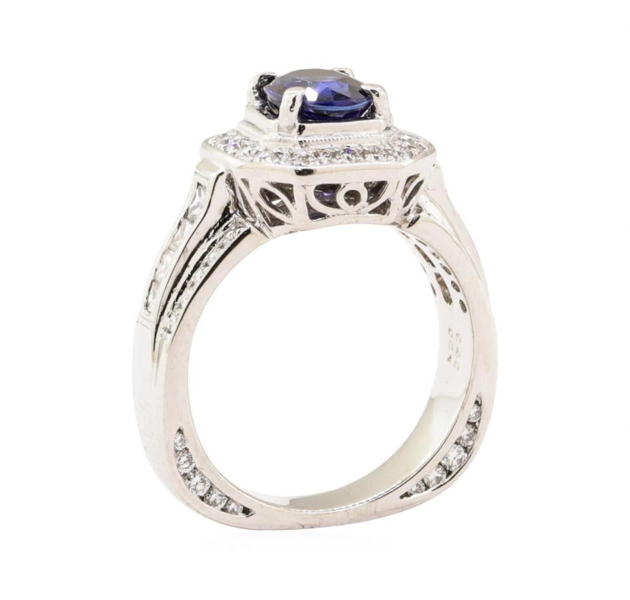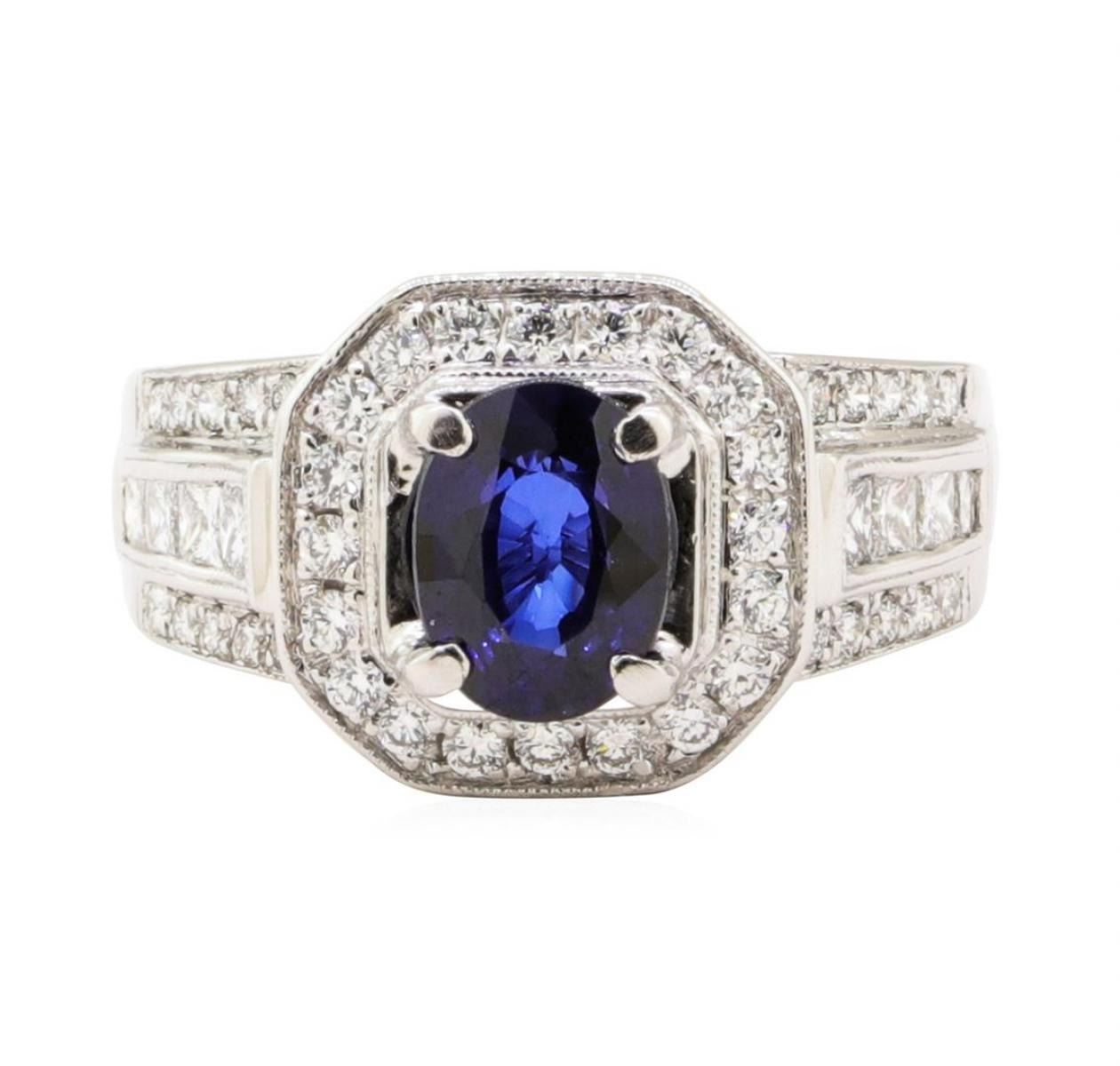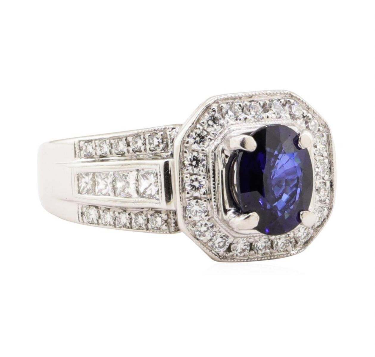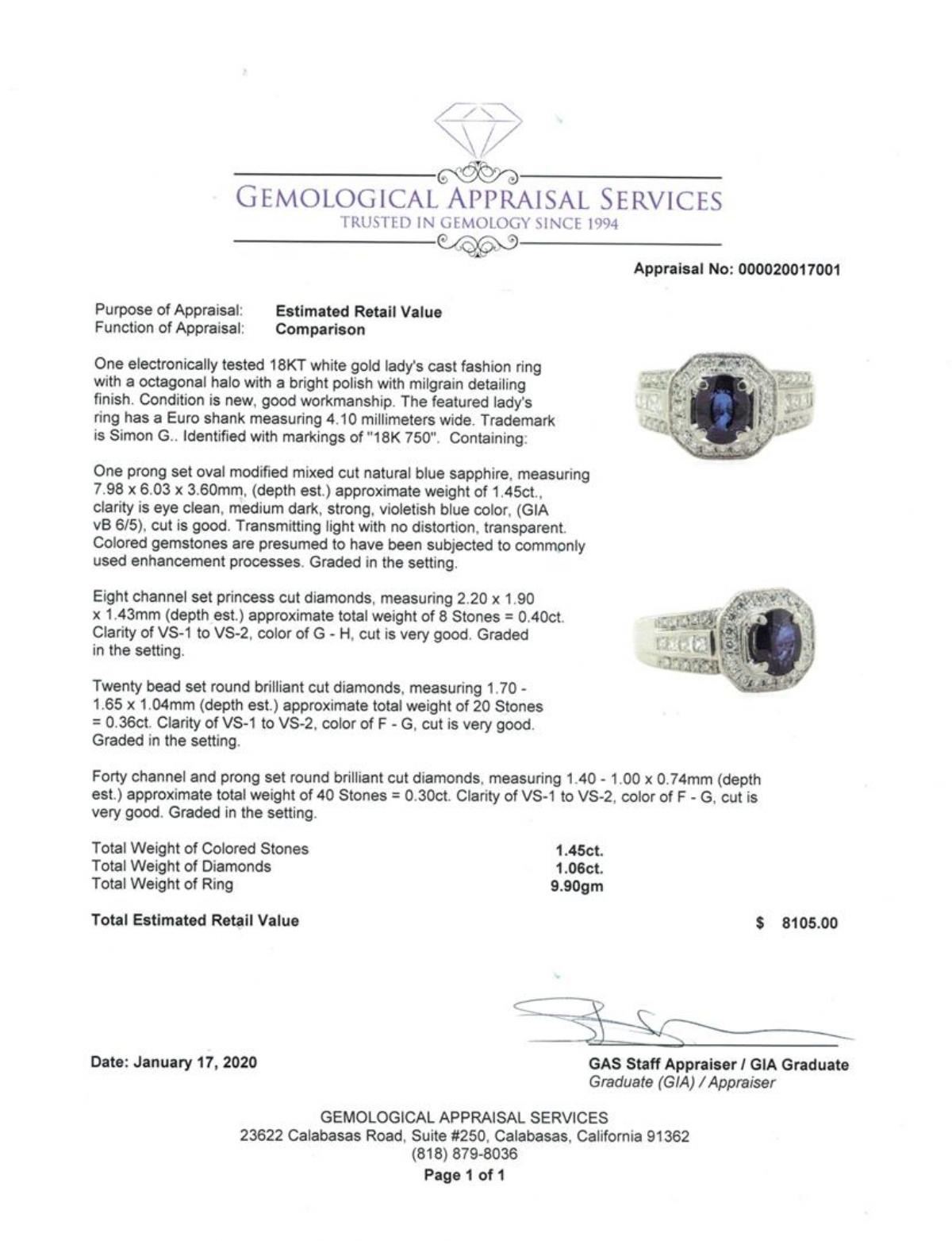One electronically tested 18KT white gold lady's cast fashion ring with a octagonal halo with a bright polish with milgrain detailing finish. The featured lady's ring has a Euro shank measuring 4.10 millimeters wide. Trademark is Simon G. Identified with markings of '18K 750'. Condition is new, good workmanship. Containing: One prong set oval modified mixed cut natural blue sapphire, measuring 7.98 x 6.03 x 3.60mm, (depth est.) approximate weight of 1.45ct., clarity is eye clean, medium dark, strong, violetish blue color, (GIA vB 6/5), cut is good. Transmitting light with no distortion, transparent. Colored gemstones are presumed to have been subjected to commonly used enhancement processes. Graded in the setting. Eight channel set princess cut diamonds, measuring 2.20 x 1.90 x 1.43mm (depth est.) approximate total weight of 8 Stones = 0.40 ct. Graded in the setting. Color G - H Clarity VS-1 to VS-2 Cut Very Good Twenty bead set round brilliant cut diamonds, measuring 1.70 - 1.65 x 1.04mm (depth est.) approximate total weight of 20 Stones = 0.36ct. Graded in the setting. Color F - G Clarity VS-1 to VS-2 Cut Very Good Forty channel and prong set round brilliant cut diamonds, measuring 1.40 - 1.00 x 0.74mm (depth est.) approximate total weight of 40 Stones = 0.30 ct. Graded in the setting. Color F - G Clarity VS-1 to VS-2 Cut Very Good. Total Weight of Colored Stones 1.45ct.. Total Weight of Diamonds 1.06ct.. Total Weight of Ring 9.90gm GAS Appraised at $8105.00. GAS Appraised.