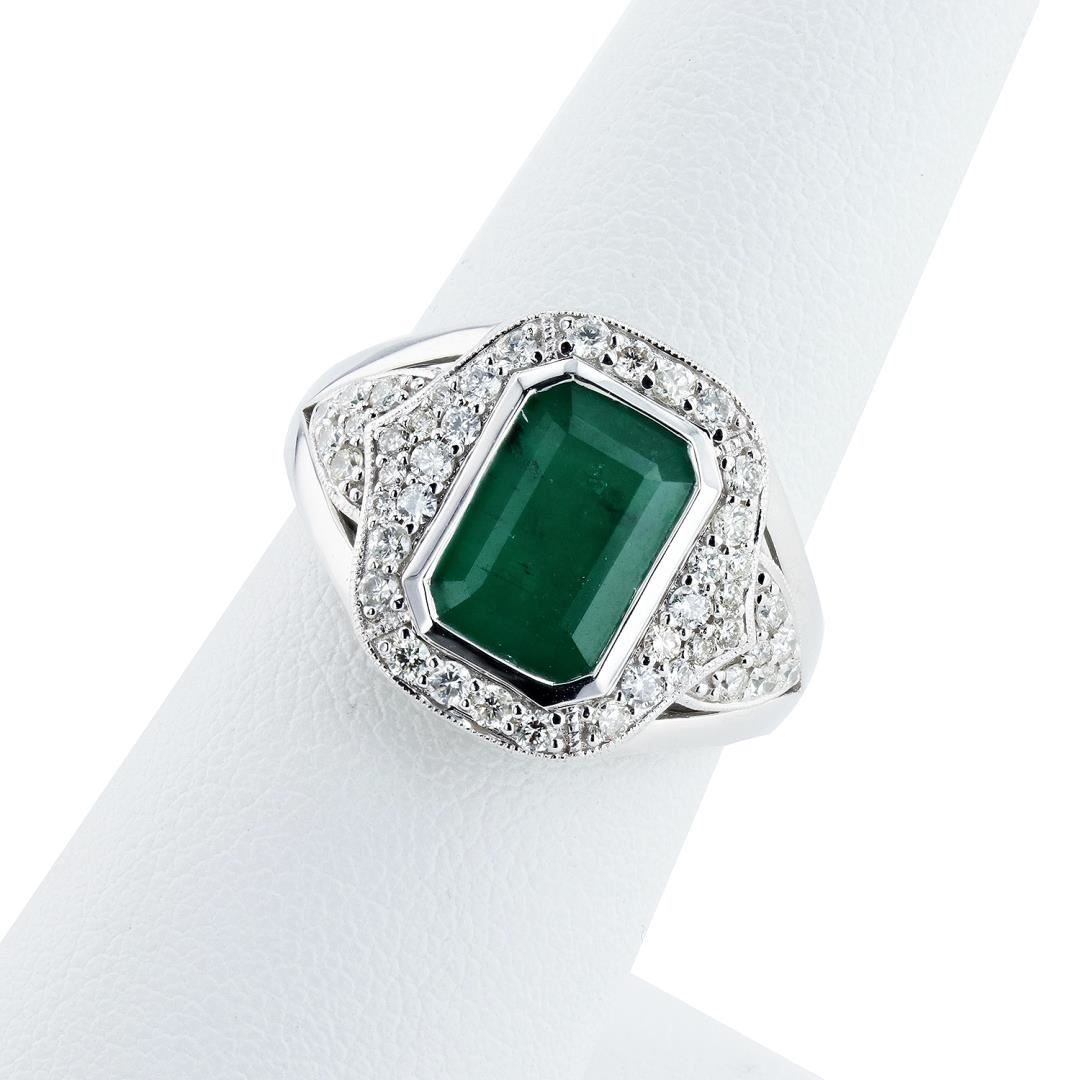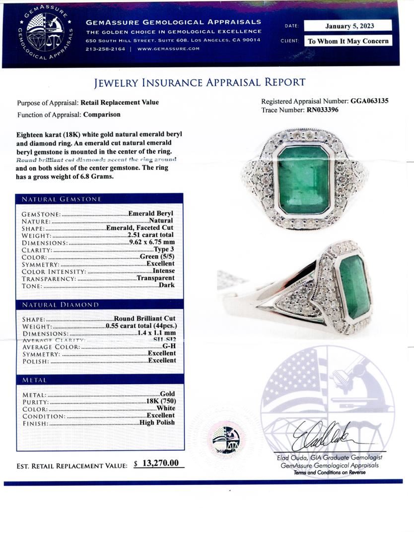 Eighteen karat (18K) white gold natural emerald beryl and diamond ring. An emerald cut natural emerald beryl gemstone is mounted in the center of the ring. Round brilliant cut diamonds accent the ring around and on both sides of the center gemstone. The ring has a gross weight of 6.8 Grams. #NATURAL GEMSTONE# GEMSTONE: Emerald Beryl NATURE: Natural SHAPE: Emerald, Faceted Cut WEIGHT: 2.51 carat total DIMENSIONS: 9.62 x 6.75mm CLARITY: Type 3 COLOR: Green (5/5) SYMMETRY: Excellent COLOR INTENSITY: Intense TRANSPARENCY: Transparent TONE: Dark #NATURAL DIAMOND# SHAPE: Round Brilliant Cut WEIGHT: 0.55 carat total (44pcs.) DIMENSIONS: 1.4 x 1.1mm AVERAGE CLARITY: SI1-SI2 AVERAGE COLOR: G-H SYMMETRY: Excellent POLISH: Excellent #METAL# METAL: Gold PURITY: 18K (750) COLOR: White CONDITION: Excellent FINISH: High Polish