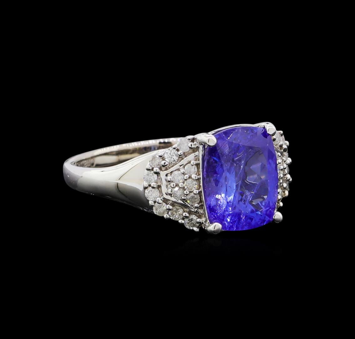 One electronically tested 14KT white gold ladies cast tanzanite and diamond ring with a bright polish finish. The featured tanzanite is supported by elaborate diamond accented shoulders, completed by a one and one-half millimeter wide band. Trademark is Orianne. Identified with markings of "14K". Condition is new, good workmanship. Containing: One prong set rectangular cushion mixed cut natural tanzanite approximate weight of 2.51ct., clarity is moderately included, type I, medium, very slightly grayish, bluish violet color, (GIA bV 5/3), cut is good. Transmitting light with a minimum of distortion,transparent. Naturally occurring internal & external characteristics are present.Graded in the setting.Tanzanite is a very rare gemstone that is only found in the country of Tanzania. Originally discovered in 1967. Tiffany & Company, named the stone Tanzanite. It is found in the Usumburu Mountains that border the Umba Valley of northern Tanzania. Tanzanite occurs in gray, brown, violet, blue, reddish-purple, & green. The gem is interesting because of its exceptional pleochroism. Rotated in different directions a tanzanite will exhibit multiple changes of color. Tanzanite has a low tolerance to ultrasonic cleaning, and should not be cleaned using this method.Twenty-Six prong set round brilliant cut diamonds approximate total weight of 26 Stones = 0.24ct. Graded in the setting. Clarity: I-1 to I-2. Color: G - I. Total Weight of Colored Stones 2.51ct. Total Weight of Diamonds 0.24ct. Total Weight of Ring 3.56gm. AIG Appraised at $4,905.00.