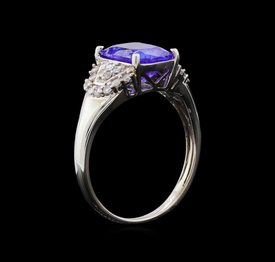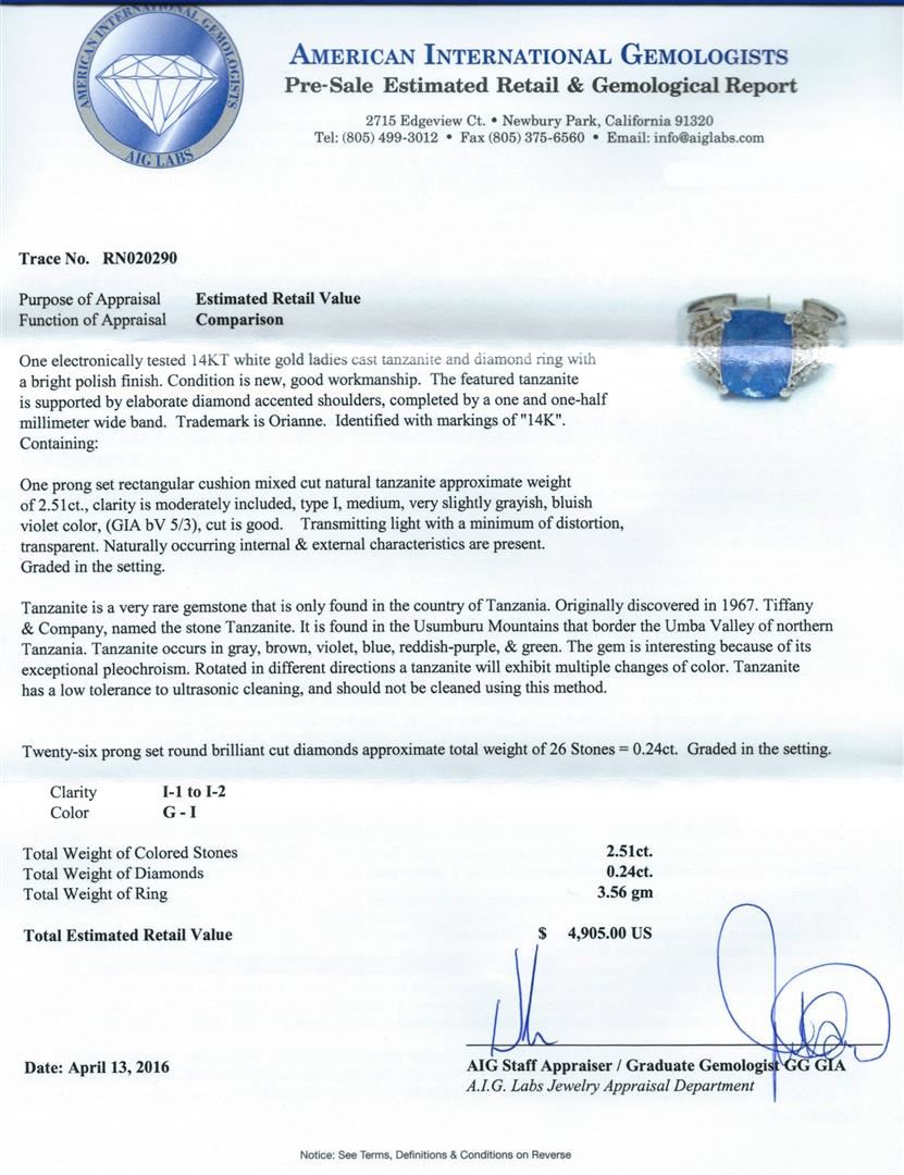 One electronically tested 14KT white gold ladies cast tanzanite and diamond ring with a bright polish finish. The featured tanzanite is supported by elaborate diamond accented shoulders, completed by a one and one-half millimeter wide band. Trademark is Orianne. Identified with markings of "14K". Condition is new, good workmanship. Containing: One prong set rectangular cushion mixed cut natural tanzanite approximate weight of 2.51ct., clarity is moderately included, type I, medium, very slightly grayish, bluish violet color, (GIA bV 5/3), cut is good. Transmitting light with a minimum of distortion,transparent. Naturally occurring internal & external characteristics are present.Graded in the setting.Tanzanite is a very rare gemstone that is only found in the country of Tanzania. Originally discovered in 1967. Tiffany & Company, named the stone Tanzanite. It is found in the Usumburu Mountains that border the Umba Valley of northern Tanzania. Tanzanite occurs in gray, brown, violet, blue, reddish-purple, & green. The gem is interesting because of its exceptional pleochroism. Rotated in different directions a tanzanite will exhibit multiple changes of color. Tanzanite has a low tolerance to ultrasonic cleaning, and should not be cleaned using this method.Twenty-Six prong set round brilliant cut diamonds approximate total weight of 26 Stones = 0.24ct. Graded in the setting. Clarity: I-1 to I-2. Color: G - I. Total Weight of Colored Stones 2.51ct. Total Weight of Diamonds 0.24ct. Total Weight of Ring 3.56gm. AIG Appraised at $4,905.00.