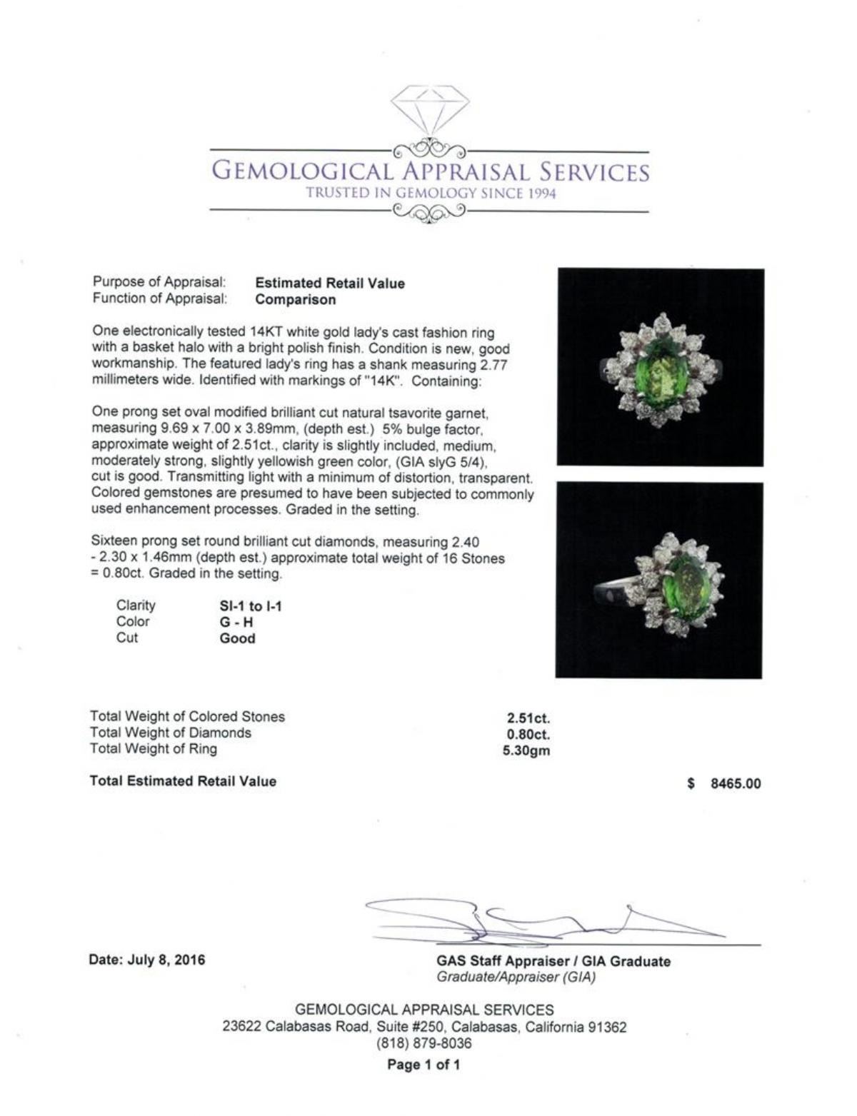 One electronically tested 14KT white gold lady's cast fashion ring with a basket halo with a bright polish finish. The featured lady's ring has a shank measuring 2.77 millimeters wide. Identified with markings of "14K". Condition is new, good workmanship. Containing: One prong set oval modified brilliant cut natural tsavorite garnet, measuring 9.69 x 7.00 x 3.89mm, (depth est.) 5%. bulge factor, approximate weight of 2.51ct., clarity is slightly included, medium, moderately strong, slightly yellowish green color, (GIA slyG 5/4), cut is good. Transmitting light with a minimum of distortion, transparent. Colored gemstones are presumed to have been subjected to commonly used enhancement processes. Graded in the setting. Sixteen prong set round brilliant cut diamonds, measuring 2.40 - 2.30 x 1.46mm (depth est.) approximate total weight of 16 Stones = 0.80ct. Graded in the setting. Clarity: SI-1 to I-1. Color: G - Good. Total Weight of Colored Stones 2.51ct. Total Weight of Diamonds 0.80ct. Total Weight of Ring 5.30gm. GAS Appraised.