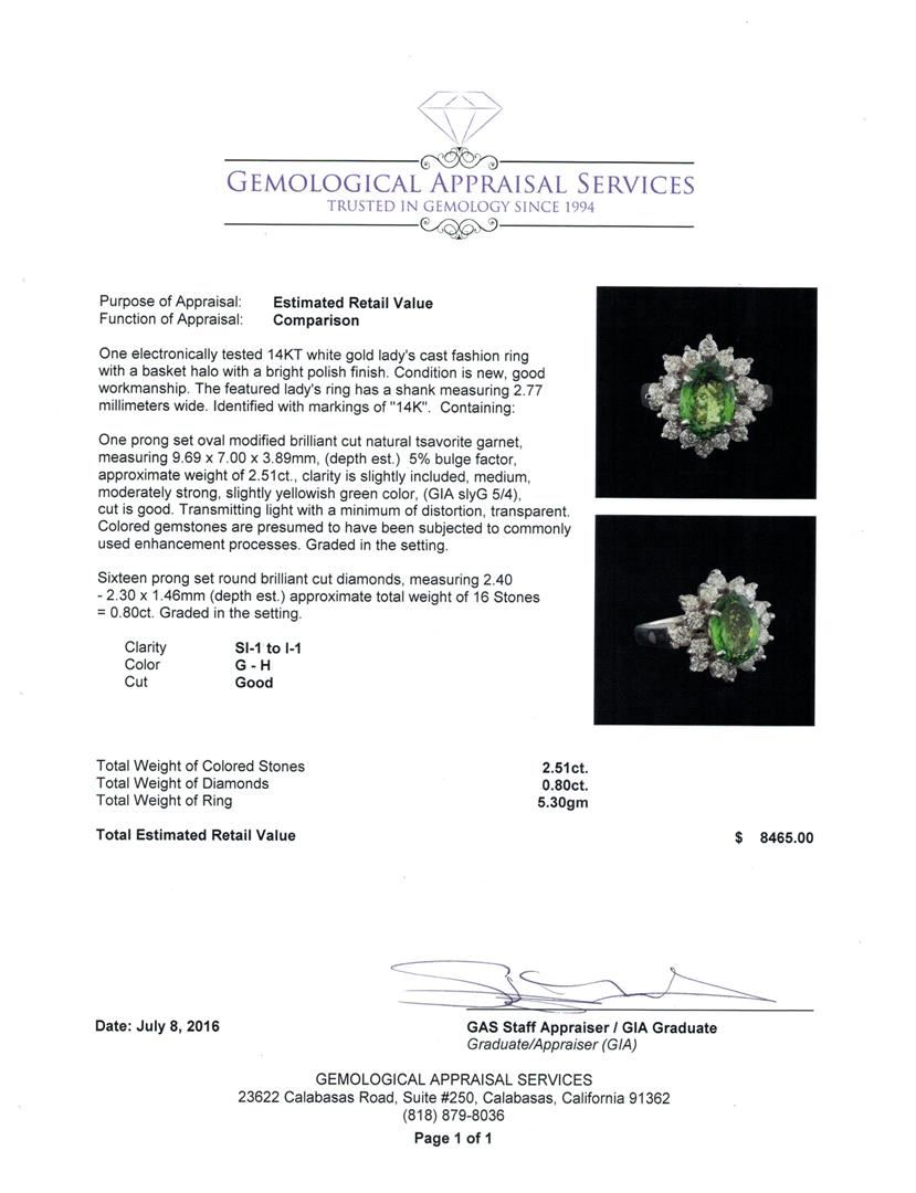 One electronically tested 14KT white gold lady's cast fashion ring with a basket halo with a bright polish finish. The featured lady's ring has a shank measuring 2.77 millimeters wide. Identified with markings of "14K". Condition is new, good workmanship. Containing: One prong set oval modified brilliant cut natural tsavorite garnet, measuring 9.69 x 7.00 x 3.89mm, (depth est.) 5%. bulge factor, approximate weight of 2.51ct., clarity is slightly included, medium, moderately strong, slightly yellowish green color, (GIA slyG 5/4), cut is good. Transmitting light with a minimum of distortion, transparent. Colored gemstones are presumed to have been subjected to commonly used enhancement processes. Graded in the setting. Sixteen prong set round brilliant cut diamonds, measuring 2.40 - 2.30 x 1.46mm (depth est.) approximate total weight of 16 Stones = 0.80 ct. Graded in the setting. Clarity: SI-1 to I-1. Color: G - Good. Total Weight of Colored Stones 2.51ct. Total Weight of Diamonds 0.80 ct. Total Weight of Ring 5.30gm. GAS Appraised.