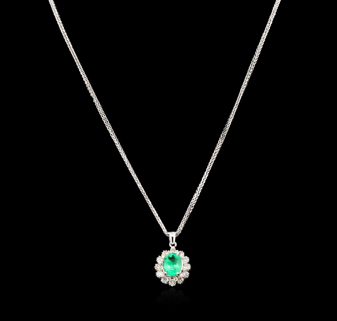 One electronically tested 14KT white gold ladies cast emerald and diamond pendant & chain 18.0" long, with a lobster claw clasp with a bright polish finish. Identified with markings of "14K". Condition is new. Containing: One prong set oval modified brilliant cut natural emerald, measuring 10.28 x 8.13 x 5.28mm, approximate weight of 2.52ct., clarity is heavily included, type III, medium, moderately strong, green color, (GIA G 5/4), cut is good. Twelve prong set round brilliant cut diamonds, measuring 2.50 - 2.50 x 1.50mm (depth est.) approximate. Total Weight of 12 Stones = 0.69ct. Clarity: SI-2 to I-1. Color: J - K, Cut is Good. Twelve prong set round brilliant cut diamonds, measuring 1.30 - 1.30 x 0.78mm (depth est.) approximate. Total Weight of 12 Stones = 0.10ct. Clarity: SI-2 to I-1. Color: I - J, Cut is Good. Colored gemstones are presumed to have been subjected to commonly used enhancement processes. All diamonds and colored gemstones are graded in the mounting, unless otherwise stated. Total Weight of Colored Stones 2.52ct. Total Weight of Diamonds 0.78ct. Total Weight of Pendant & Chain 6.60 grams. GGL Appraised at $4,220.00.