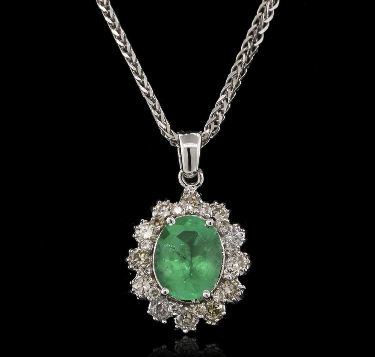 One electronically tested 14KT white gold ladies cast emerald and diamond pendant & chain 18.0" long, with a lobster claw clasp with a bright polish finish. Identified with markings of "14K". Condition is new. Containing: One prong set oval modified brilliant cut natural emerald, measuring 10.28 x 8.13 x 5.28mm, approximate weight of 2.52ct., clarity is heavily included, type III, medium, moderately strong, green color, (GIA G 5/4), cut is good. Twelve prong set round brilliant cut diamonds, measuring 2.50 - 2.50 x 1.50mm (depth est.) approximate. Total Weight of 12 Stones = 0.69ct. Clarity: SI-2 to I-1. Color: J - K, Cut is Good. Twelve prong set round brilliant cut diamonds, measuring 1.30 - 1.30 x 0.78mm (depth est.) approximate. Total Weight of 12 Stones = 0.10ct. Clarity: SI-2 to I-1. Color: I - J, Cut is Good. Colored gemstones are presumed to have been subjected to commonly used enhancement processes. All diamonds and colored gemstones are graded in the mounting, unless otherwise stated. Total Weight of Colored Stones 2.52ct. Total Weight of Diamonds 0.78ct. Total Weight of Pendant & Chain 6.60 grams. GGL Appraised.