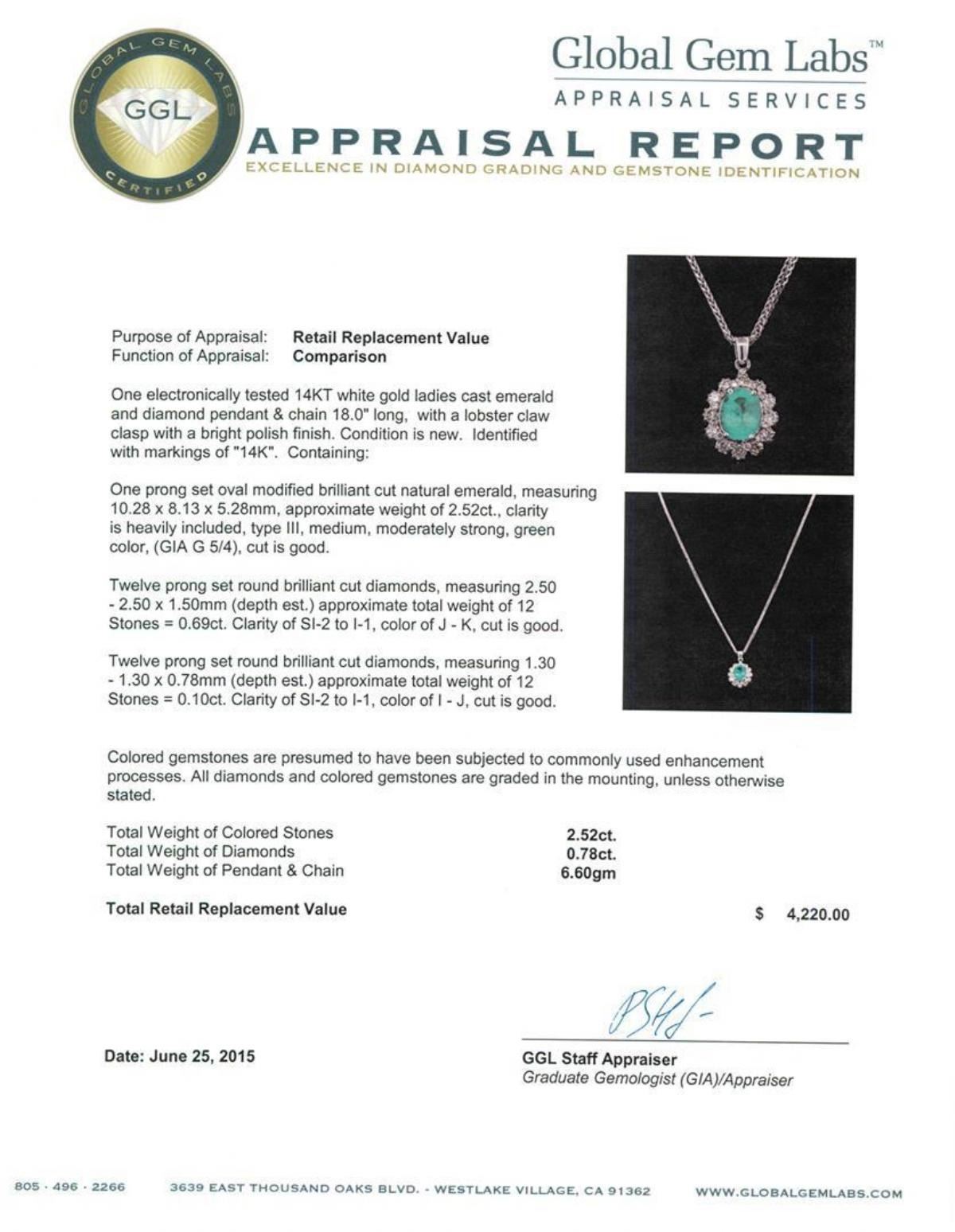 One electronically tested 14KT white gold ladies cast emerald and diamond pendant & chain 18.0" long, with a lobster claw clasp with a bright polish finish. Identified with markings of "14K". Condition is new. Containing: One prong set oval modified brilliant cut natural emerald, measuring 10.28 x 8.13 x 5.28mm, approximate weight of 2.52ct., clarity is heavily included, type III, medium, moderately strong, green color, (GIA G 5/4), cut is good. Twelve prong set round brilliant cut diamonds, measuring 2.50 - 2.50 x 1.50mm (depth est.) approximate. Total Weight of 12 Stones = 0.69ct. Clarity: SI-2 to I-1. Color: J - K, Cut is Good. Twelve prong set round brilliant cut diamonds, measuring 1.30 - 1.30 x 0.78mm (depth est.) approximate. Total Weight of 12 Stones = 0.10ct. Clarity: SI-2 to I-1. Color: I - J, Cut is Good. Colored gemstones are presumed to have been subjected to commonly used enhancement processes. All diamonds and colored gemstones are graded in the mounting, unless otherwise stated. Total Weight of Colored Stones 2.52ct. Total Weight of Diamonds 0.78ct. Total Weight of Pendant & Chain 6.60 grams. GGL Appraised.