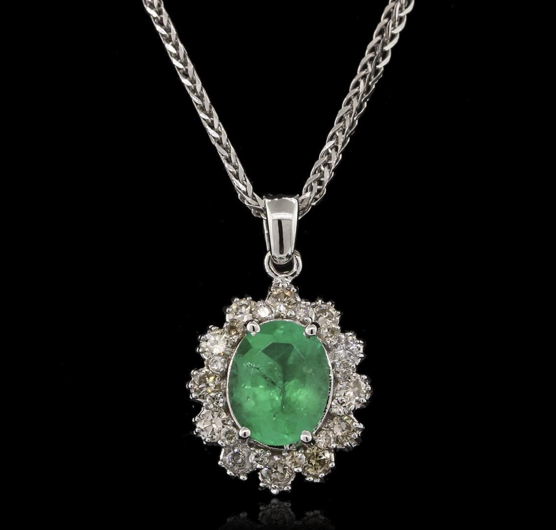 One electronically tested 14KT white gold ladies cast emerald and diamond pendant & chain 18.0" long, with a lobster claw clasp with a bright polish finish. Identified with markings of "14K". Condition is new. Containing: One prong set oval modified brilliant cut natural emerald, measuring 10.28 x 8.13 x 5.28mm, approximate weight of 2.52ct., clarity is heavily included, type III, medium, moderately strong, green color, (GIA G 5/4), cut is good. Twelve prong set round brilliant cut diamonds, measuring 2.50 - 2.50 x 1.50mm (depth est.) approximate. Total Weight of 12 Stones = 0.69ct. Clarity: SI-2 to I-1. Color: J - K, Cut is Good. Twelve prong set round brilliant cut diamonds, measuring 1.30 - 1.30 x 0.78mm (depth est.) approximate. Total Weight of 12 Stones = 0.10 ct. Clarity: SI-2 to I-1. Color: I - J, Cut is Good. Colored gemstones are presumed to have been subjected to commonly used enhancement processes. All diamonds and colored gemstones are graded in the mounting, unless otherwise stated. Total Weight of Colored Stones 2.52ct. Total Weight of Diamonds 0.78ct. Total Weight of Pendant & Chain 6.60 grams. GGL Appraised.