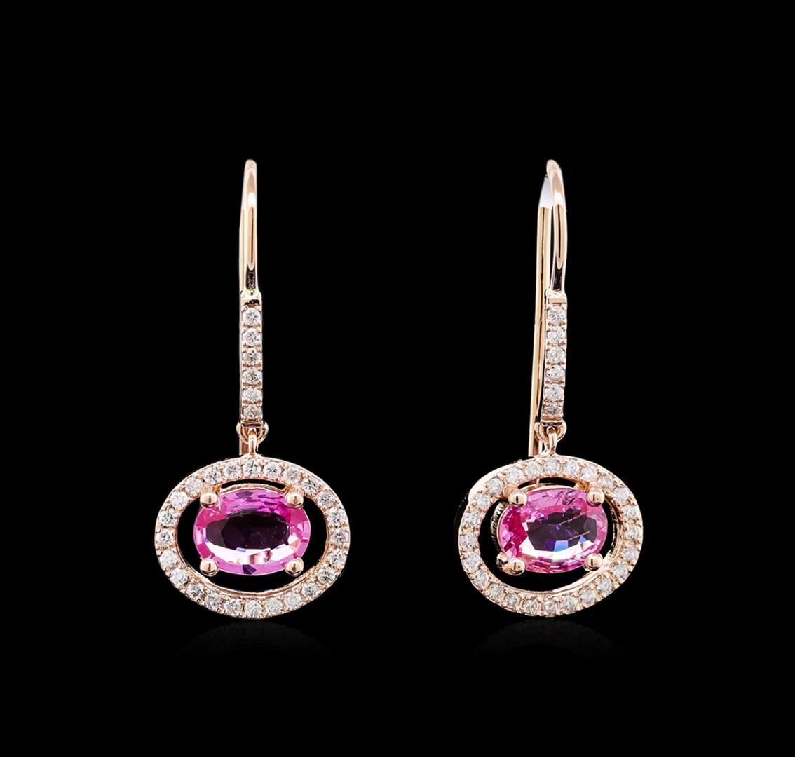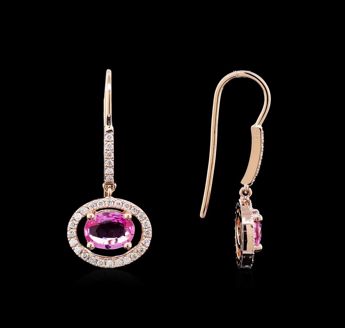 One pair of earrings featuring: 14KT rose gold weighing 5.50 grams containing two pink sapphires with a total weight of 2.52ct and diamonds with a total weight of 0.48ct.