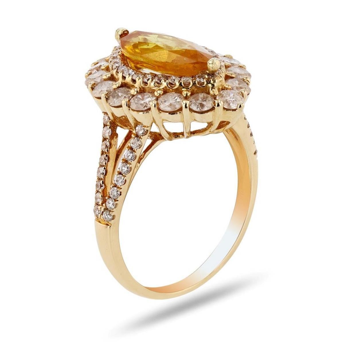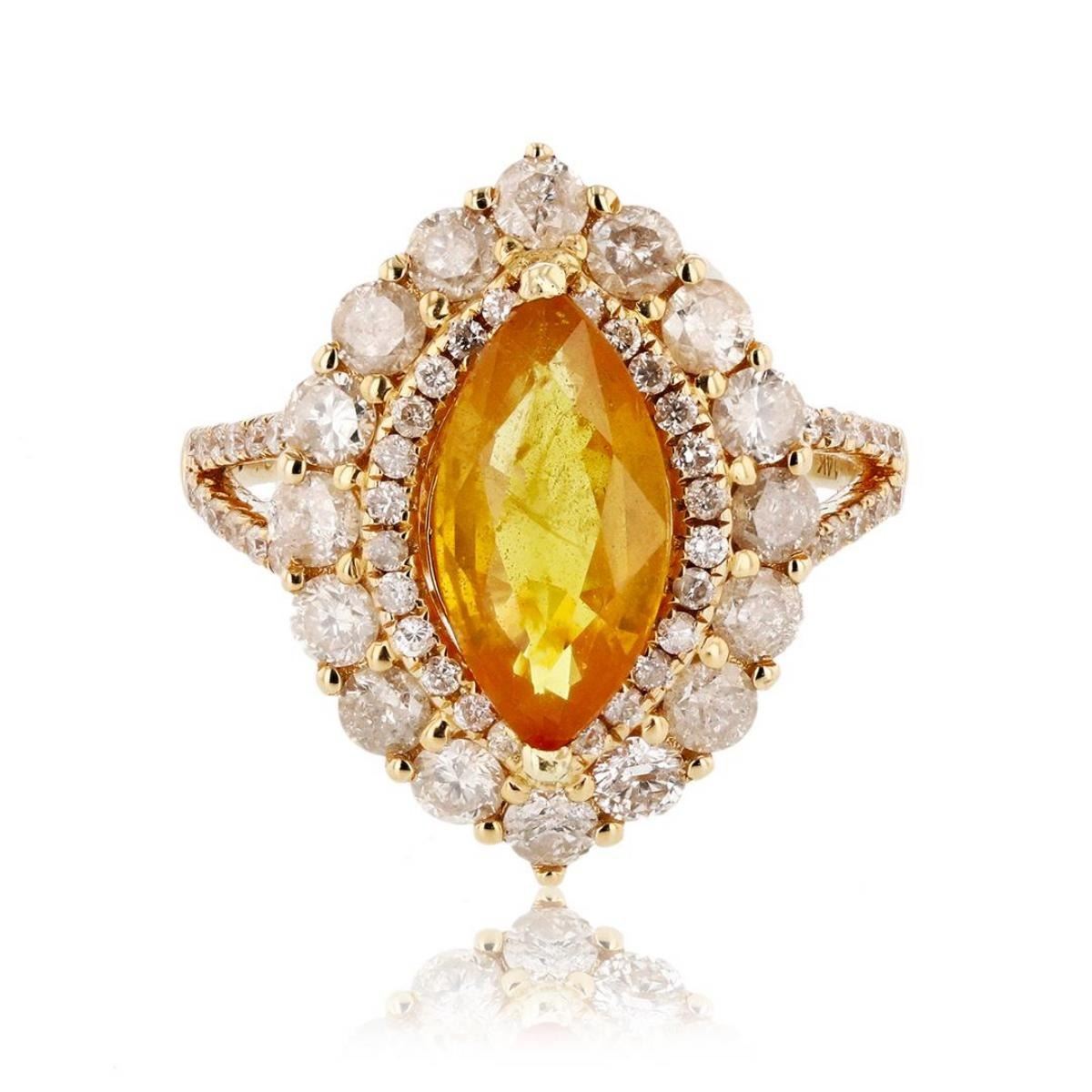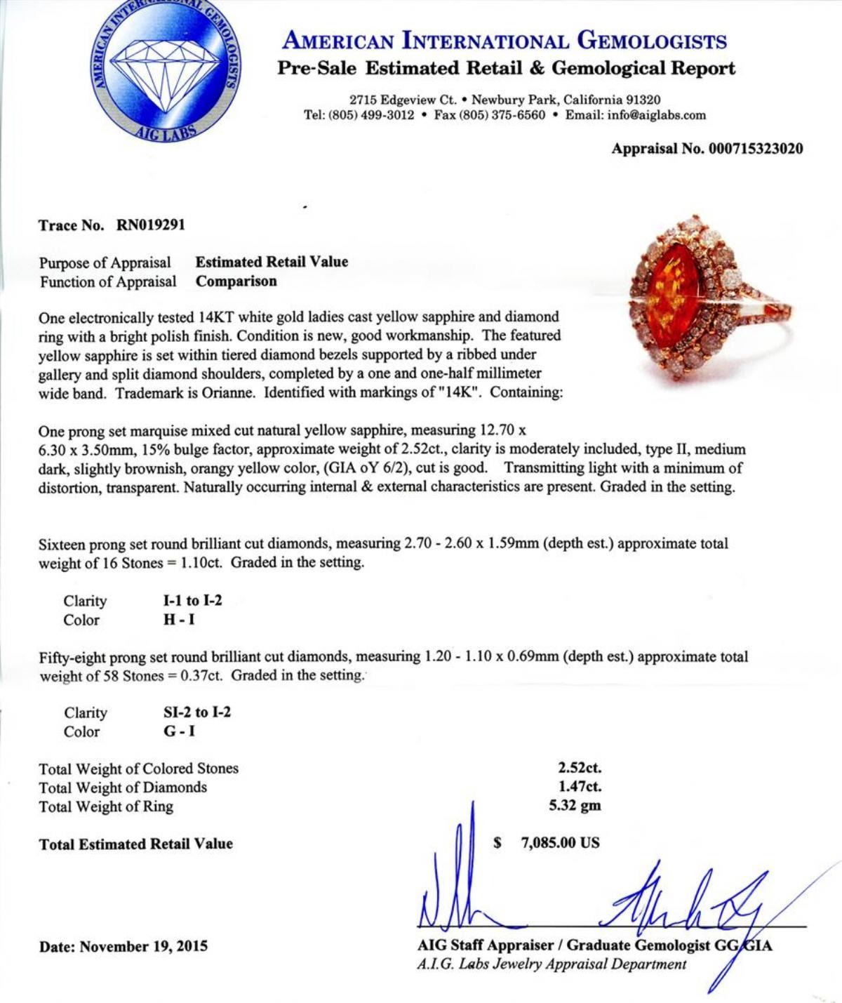 One electronically tested 14KT white gold ladies cast yellow sapphire and diamond ring with a bright polish finish. Condition is new, good workmanship. The featured yellow sapphire is set within tiered diamond bezels supported by a ribbed under gallery and split diamond shoulders, completed by a one and one-half millimeter wide band. Trademark is Orianne. Identified with markings of "14K". Containing: One prong set marquise mixed cut natural yellow sapphire, measuring 12.70 x 6.30 x 3.50mm, 15% bulge factor, approximate weight of 2.52ct., clarity is moderately included, type II, medium dark, slightly brownish, orangy yellow color, (GIA oY 6/2), cut is good. Transmitting light with a minimum of distortion, transparent. Naturally occurring internal and external characteristics are present. Graded in the setting. Sixteen prong set round brilliant cut diamonds, measuring 2.70 - 2.60 x 1.59mm (depth est.) approximate total weight of 16 Stones = 1.10ct. Graded in the setting. Clarity I-1 to I-2 Color H-I Fifty-eight prong set round brilliant cut diamonds, measuring 1.20 - 1.10 x 0.69mm (depth est.) approximate total weight of 58 Stones = 0.37ct. Graded in the setting: Clarity SI-2 to I-2 Color G-I Total Weight of Colored Stones 2.52ct. Total Weight of Diamonds 1.47ct. Total Weight of Ring 5.32 gm