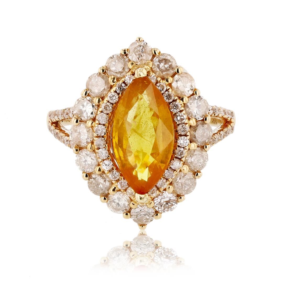 One electronically tested 14KT white gold ladies cast yellow sapphire and diamond ring with a bright polish finish. Condition is new, good workmanship. The featured yellow sapphire is set within tiered diamond bezels supported by a ribbed under gallery and split diamond shoulders, completed by a one and one-half millimeter wide band. Trademark is Orianne. Identified with markings of "14K". Containing:    One prong set marquise mixed cut natural yellow sapphire, measuring 12.70 x 6.30 x 3.50mm, 15% bulge factor, approximate weight of 2.52ct., clarity is moderately included, type II, medium dark, slightly brownish, orangy yellow color, (GIA oY 6/2), cut is good. Transmitting light with a minimum of distortion, transparent. Naturally occurring internal and external characteristics are present. Graded in the setting.   Sixteen prong set round brilliant cut diamonds, measuring 2.70 - 2.60 x 1.59mm (depth est.) approximate total weight of 16 Stones = 1.10ct. Graded in the setting.   Clarity I-1 to I-2  Color   H-I   Fifty-eight prong set round brilliant cut diamonds, measuring 1.20 - 1.10 x 0.69mm (depth est.) approximate total weight of 58 Stones = 0.37ct. Graded in the setting:   Clarity SI-2 to I-2  Color   G-I   Total Weight of Colored Stones 2.52ct. Total Weight of Diamonds 1.47ct. Total Weight of Ring 5.32 gm