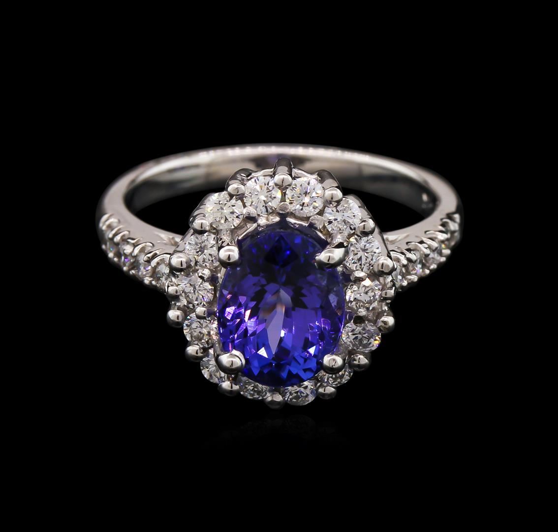 One electronically tested 14KT white gold ladies cast tanzanite and diamond ring with a bright polish finish. The featured tanzanite is set within a diamond bezel supported by diamond set shoulders, completed by a two millimeter wide band. Trademark is 14K. Condition is new, good workmanship. Containing: One prong set oval mixed cut natural tanzanite, measuring 8.65 x 6.63 x 5.77mm, exact weight 2.52ct., clarity is eye clean, type I, medium dark, very slightly grayish, bluish violet color, (GIA bV 6/3), cut is good. Transmitting light with no distortion, transparent. Graded in the setting. Tanzanite is a very rare gemstone that is only found in the country of Tanzania. Originally discovered in 1967. Tiffany & Company, named the stone Tanzanite. It is found in the Usumburu Mountains that border the Umba Valley of northern Tanzania. Tanzanite occurs in gray, brown, violet, blue, reddish-purple, & green. The gem is interesting because of its exceptional pleochroism. Rotated in different directions a tanzanite will exhibit multiple changes of color. Tanzanite has a low tolerance to ultrasonic cleaning, and should not be cleaned using this method. Twenty-Two prong set round brilliant cut diamonds, measuring 2.00 - 1.60 x 1.08mm exact total weight 22 Stones = 0.61ct. Graded in the setting. Clarity: SI-1 to I-1. Color: G - I. Total Weight of Colored Stones 2.52ct. Total Weight of Diamonds 0.61ct. Total Weight of Ring 5.24gm. AIG Appraised at $7,765.00.