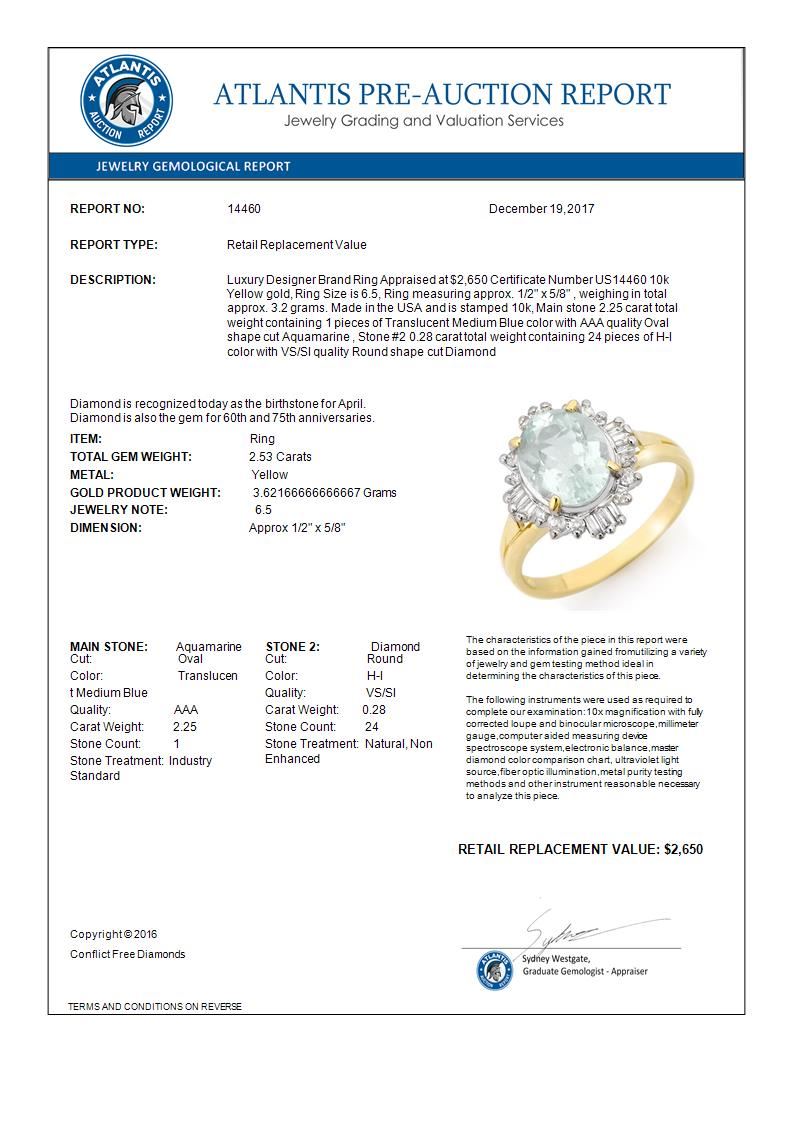 REF-40A2X -14460 ---- 2.53 CTW Aquamarine & Diamond Ring 10K Yellow Gold ---- Luxury Designer Brand Ring Appraised at $2,650 Certificate Number US14460 10k Yellow gold, Ring Size is 6.5, Ring measuring approx. 1/2" x 5/8" , weighing in total approx. 3.2 grams. Made in the USA and is stamped 10k, Main stone 2.25 carat total weight containing 1 pieces of Translucent Medium Blue color with AAA quality Oval shape cut Aquamarine , Stone #2 0.28 carat total weight containing 24 pieces of H-I color with VS/SI quality Round shape cut Diamond