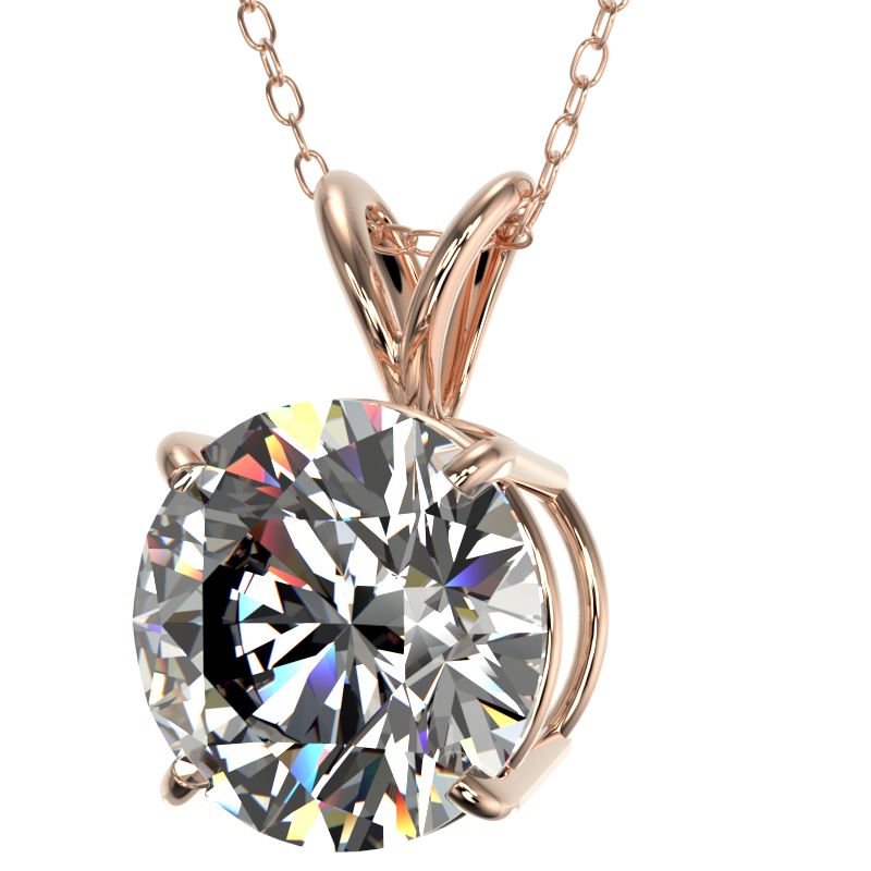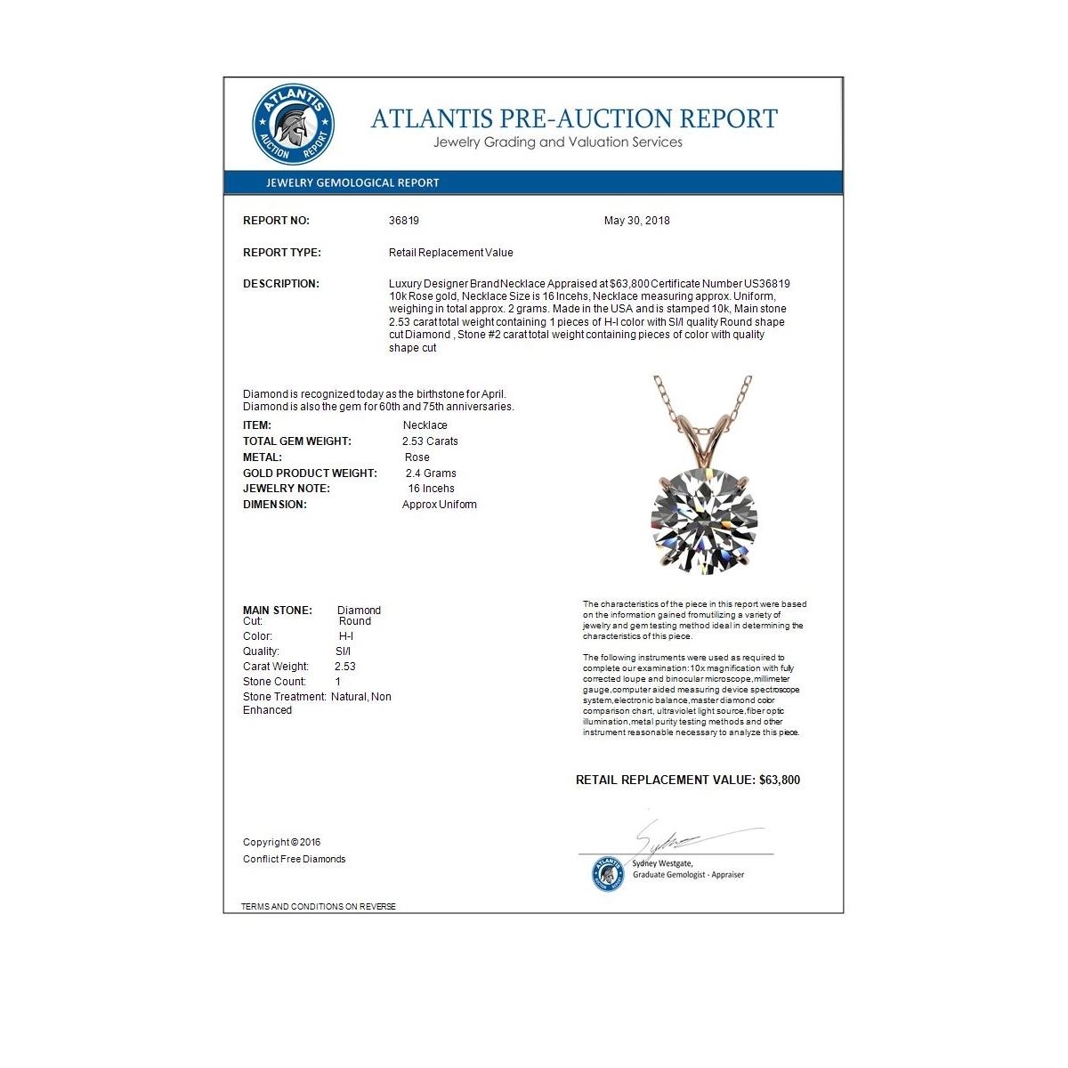 REF-870X2T -36819 ---- 2.53 CTW Certified H-SI/I Quality Diamond Solitaire Necklace 10K Rose Gold ---- Luxury Designer Brand Necklace Appraised at $63,800 Certificate Number US36819 10k Rose gold, Necklace Size is 16 Incehs, Necklace measuring approx. Uniform, weighing in total approx. 2 grams. Made in the USA and is stamped 10k, Main stone 2.53 carat total weight containing 1 pieces of H-I color with SI/I quality Round shape cut Diamond , Stone #2 carat total weight containing pieces of color with quality shape cut