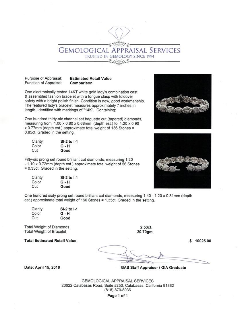 One electronically tested 14KT white gold lady's combination cast & assembled fashion bracelet with a tongue clasp with foldover safety with a bright polish finish. The featured lady's bracelet measures approximately 7 inches in length. Identified with markings of "14K". Condition is new, good workmanship. Containing: One Hundred Thirty-Six channel set baguette cut (tapered) diamonds, measuring from 1.00 x 0.80 x 0.68mm (depth est.) to 1.20 x 0.90 x 0.77mm (depth est.) approximate total weight of 136 Stones = 0.85ct. Graded in the setting. Clarity: SI-2 to I-1. Color: G - Good Fifty-Six prong set round brilliant cut diamonds, measuring 1.20 - 1.10 x 0.72mm (depth est.) approximate total weight of 56 Stones = 0.33ct. Graded in the setting. Clarity: SI-2 to I-1. Color: G - Good One Hundred Sixty prong set round brilliant cut diamonds, measuring 1.40 - 1.20 x 0.81mm (depth est.) approximate total weight of 160 Stones = 1.35ct. Graded in the setting. Clarity: SI-2 to I-1. Color: G - Good. Total Weight of Diamonds 2.53ct. Total Weight of Bracelet 20.70gm. GAS Appraised at $10,025.00.