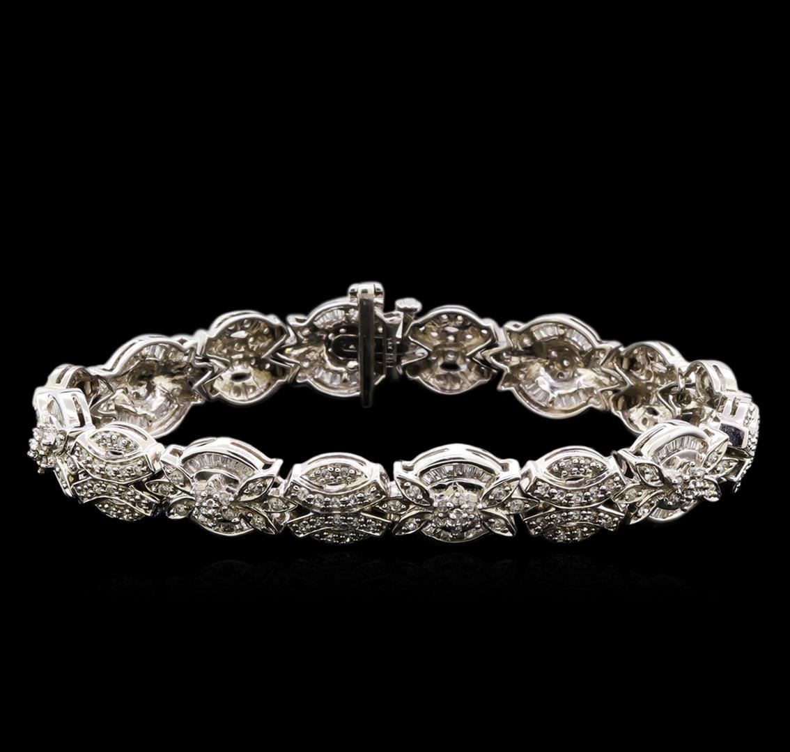 One electronically tested 14KT white gold lady's combination cast & assembled fashion bracelet with a tongue clasp with foldover safety with a bright polish finish. The featured lady's bracelet measures approximately 7 inches in length. Identified with markings of "14K". Condition is new, good workmanship. Containing: One Hundred Thirty-Six channel set baguette cut (tapered) diamonds, measuring from 1.00 x 0.80 x 0.68mm (depth est.) to 1.20 x 0.90 x 0.77mm (depth est.) approximate total weight of 136 Stones = 0.85ct. Graded in the setting. Clarity: SI-2 to I-1. Color: G - Good Fifty-Six prong set round brilliant cut diamonds, measuring 1.20 - 1.10 x 0.72mm (depth est.) approximate total weight of 56 Stones = 0.33ct. Graded in the setting. Clarity: SI-2 to I-1. Color: G - Good One Hundred Sixty prong set round brilliant cut diamonds, measuring 1.40 - 1.20 x 0.81mm (depth est.) approximate total weight of 160 Stones = 1.35ct. Graded in the setting. Clarity: SI-2 to I-1. Color: G - Good. Total Weight of Diamonds 2.53ct. Total Weight of Bracelet 20.70gm. GAS Appraised.