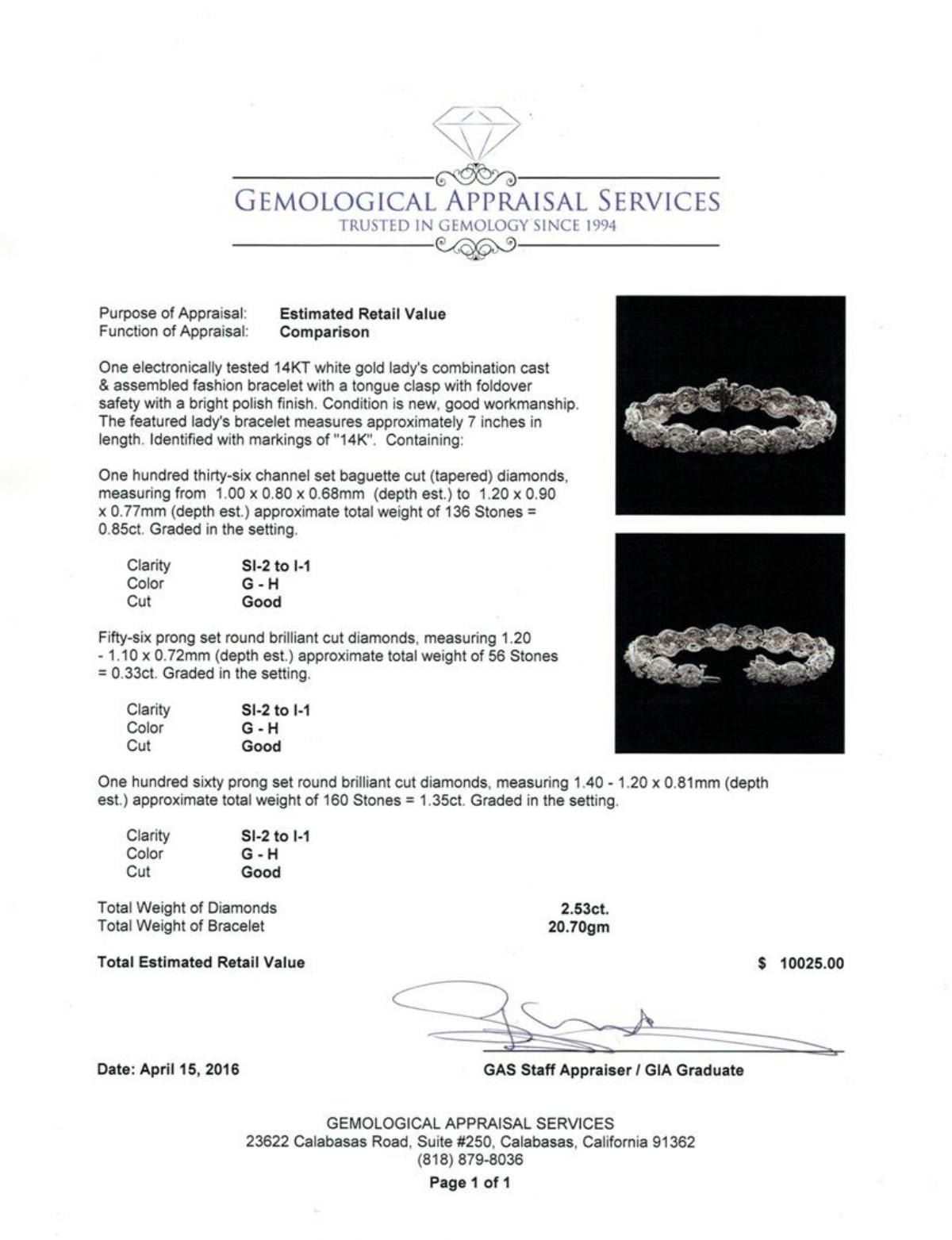 One electronically tested 14KT white gold lady's combination cast & assembled fashion bracelet with a tongue clasp with foldover safety with a bright polish finish. The featured lady's bracelet measures approximately 7 inches in length. Identified with markings of "14K". Condition is new, good workmanship. Containing: One Hundred Thirty-Six channel set baguette cut (tapered) diamonds, measuring from 1.00 x 0.80 x 0.68mm (depth est.) to 1.20 x 0.90 x 0.77mm (depth est.) approximate total weight of 136 Stones = 0.85ct. Graded in the setting. Clarity: SI-2 to I-1. Color: G -  Good Fifty-Six prong set round brilliant cut diamonds, measuring 1.20 - 1.10 x 0.72mm (depth est.) approximate total weight of 56 Stones = 0.33ct. Graded in the setting. Clarity: SI-2 to I-1. Color: G -  Good One Hundred Sixty prong set round brilliant cut diamonds, measuring 1.40 - 1.20 x 0.81mm (depth est.) approximate total weight of 160 Stones = 1.35ct. Graded in the setting. Clarity: SI-2 to I-1. Color: G -  Good. Total Weight of Diamonds 2.53ct. Total Weight of Bracelet 20.70gm. GAS Appraised.
