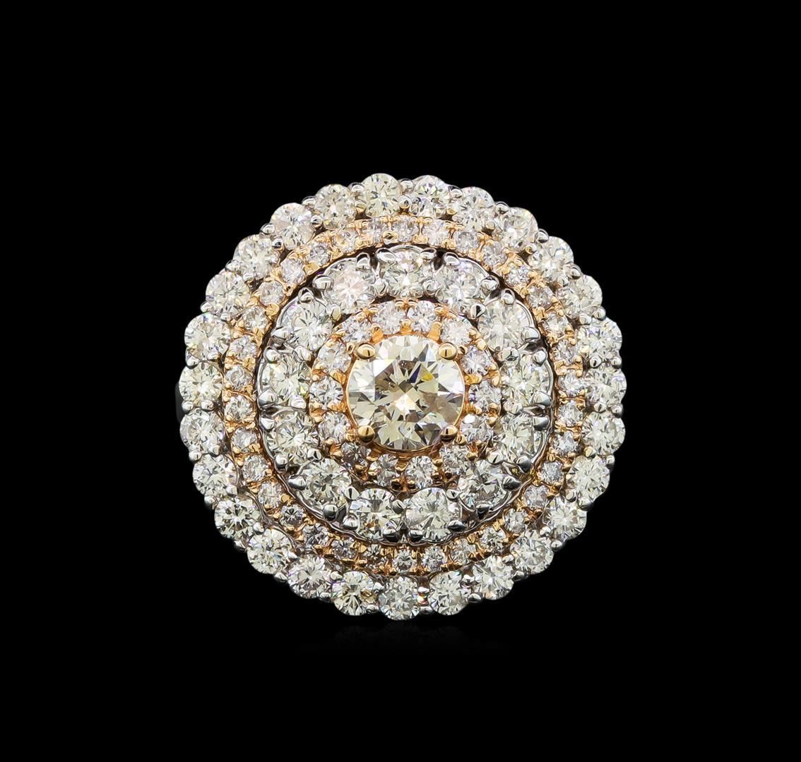 One electronically tested 14KT rose and white gold lady's combination cast & assembled fashion ring with a quadruple basket halo with a bright polish finish. The featured lady's ring has a shank measuring 3.56 millimeters wide. Identified with markings of '585'. Condition is new, good workmanship. Containing: One prong set round brilliant cut diamond, measuring 5.09 - 5.04 x 3.19mm (depth est.) approximate weight of 0.53ct. Graded in the setting. Clarity I-1. Color: I - J Cut Good Thirteen prong set round brilliant cut diamonds, measuring 2.40 - 2.35 x 1.48mm (depth est.) approximate total weight of 13 Stones = 0.66ct. Graded in the setting. Clarity SI-1 to I-1. Color: H - I Cut Good Twenty-Seven prong set round brilliant cut diamonds, measuring 2.10 - 2.00 x 1.27mm (depth est.) approximate total weight of 27 Stones = 0.88ct. Graded in the setting. Clarity SI-1 to I-1. Color: H - I Cut Good Fourteen prong set round brilliant cut diamonds, measuring 1.60 - 1.50 x 0.96mm (depth est.) approximate total weight of 14 Stones = 0.20ct. Graded in the setting. Clarity SI-1 to SI-2. Color: H - I Cut Good Thirty-Four prong set round brilliant cut diamonds, measuring 1.30 - 1.20 x 0.78mm (depth est.) approximate total weight of 34 Stones = 0.26ct. Graded in the setting. Clarity SI-1 to I-1. Color: H - I Cut Good. Total Weight of Diamonds 2.53ct.. Total Weight of Ring 6.90gm. GAS Appraised.