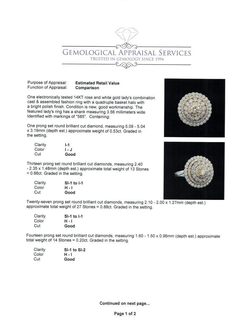 One electronically tested 14KT rose and white gold lady's combination cast & assembled fashion ring with a quadruple basket halo with a bright polish finish. The featured lady's ring has a shank measuring 3.56 millimeters wide. Identified with markings of '585'. Condition is new, good workmanship. Containing: One prong set round brilliant cut diamond, measuring 5.09 - 5.04 x 3.19mm (depth est.) approximate weight of 0.53ct. Graded in the setting. Clarity I-1. Color: I - J Cut Good Thirteen prong set round brilliant cut diamonds, measuring 2.40 - 2.35 x 1.48mm (depth est.) approximate total weight of 13 Stones = 0.66ct. Graded in the setting. Clarity SI-1 to I-1. Color: H - I Cut Good Twenty-Seven prong set round brilliant cut diamonds, measuring 2.10 - 2.00 x 1.27mm (depth est.) approximate total weight of 27 Stones = 0.88ct. Graded in the setting. Clarity SI-1 to I-1. Color: H - I Cut Good Fourteen prong set round brilliant cut diamonds, measuring 1.60 - 1.50 x 0.96mm (depth est.) approximate total weight of 14 Stones = 0.20 ct. Graded in the setting. Clarity SI-1 to SI-2. Color: H - I Cut Good Thirty-Four prong set round brilliant cut diamonds, measuring 1.30 - 1.20 x 0.78mm (depth est.) approximate total weight of 34 Stones = 0.26ct. Graded in the setting. Clarity SI-1 to I-1. Color: H - I Cut Good. Total Weight of Diamonds 2.53ct.. Total Weight of Ring 6.90gm. GAS Appraised.
