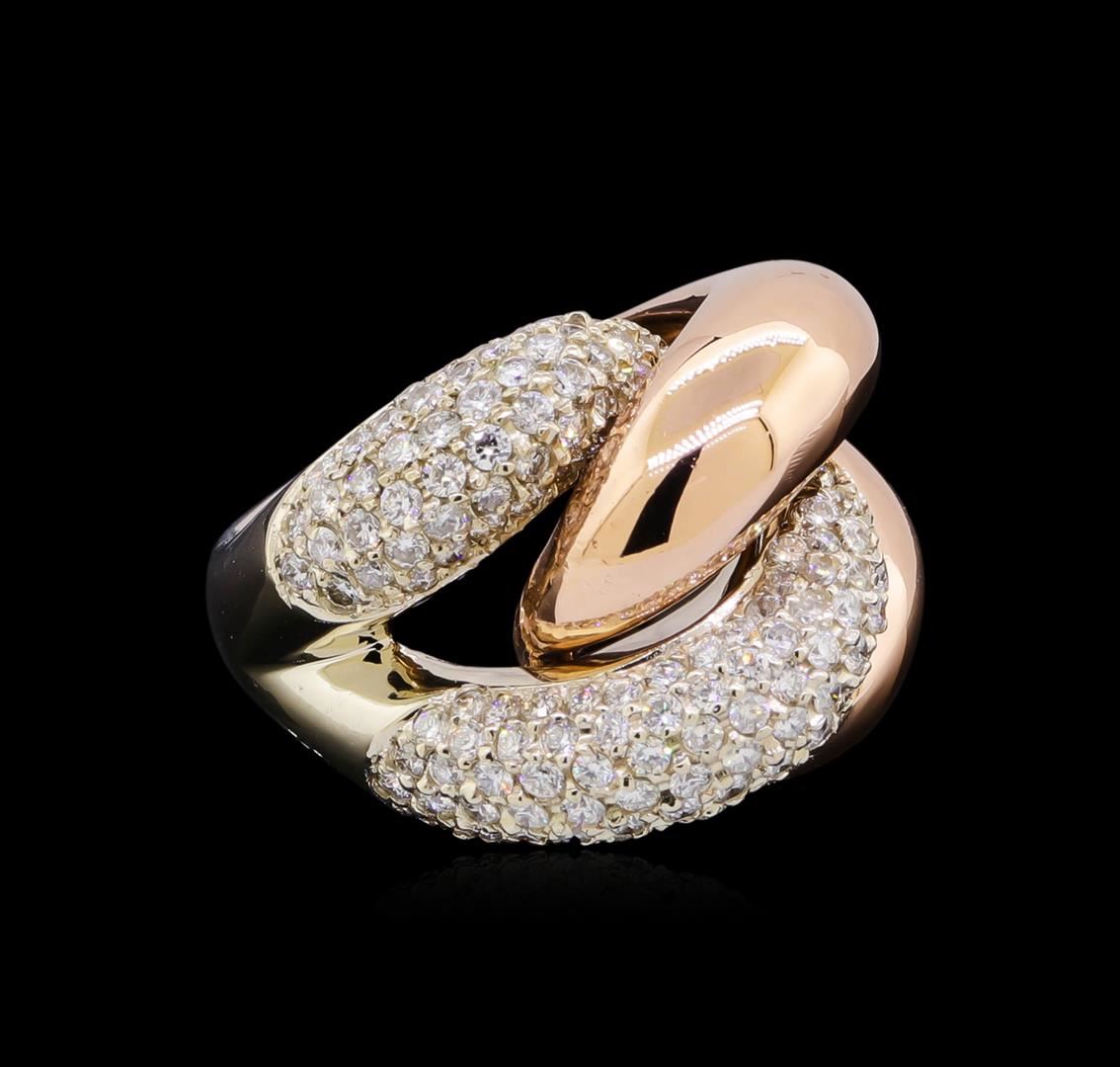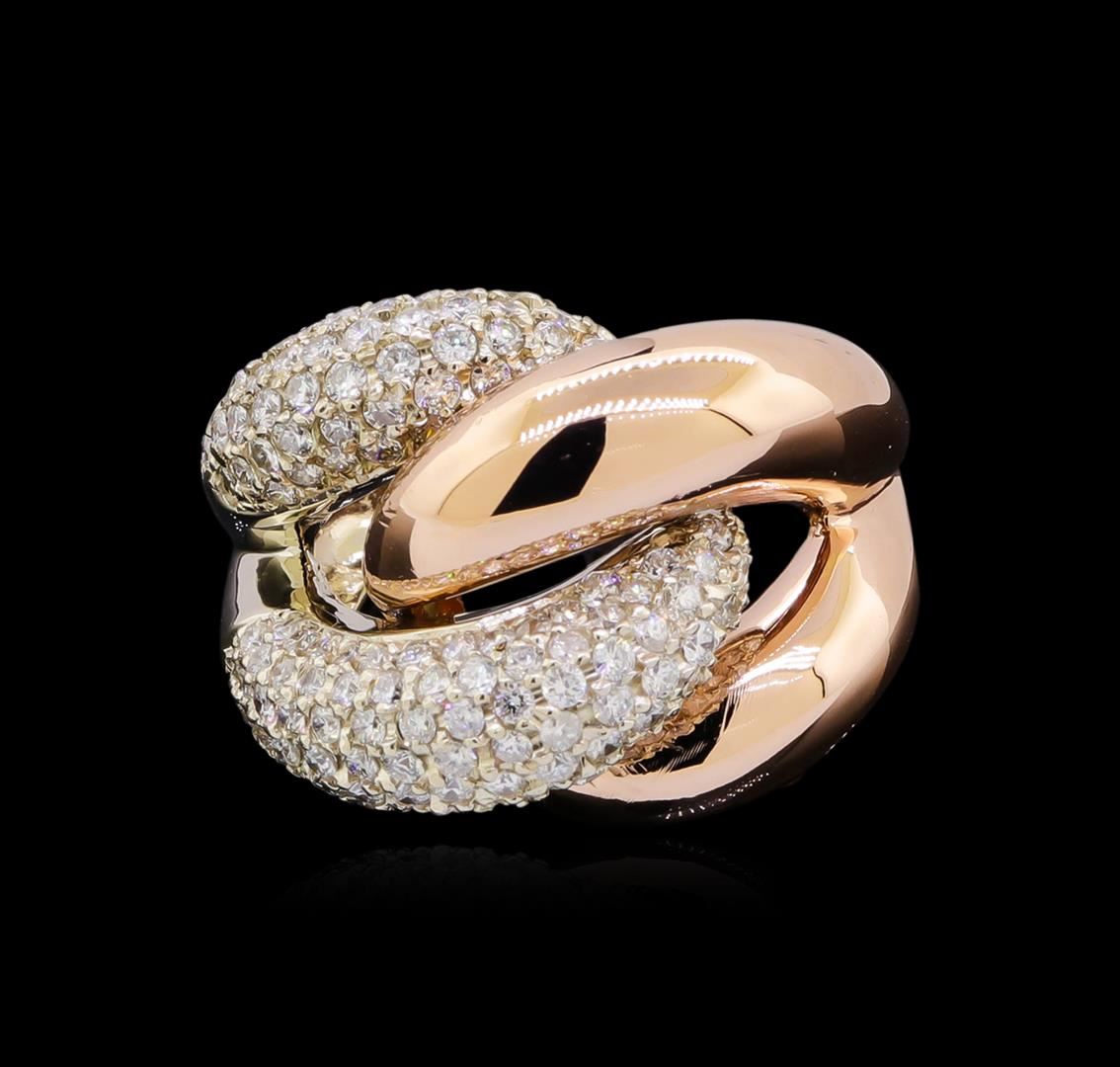 One electronically tested 14KT rose and white gold lady's combination cast & assembled fashion ring with a tapered split shank with a bright polish finish. The featured lady's ring has a shank measuring 3.76 millimeters wide. Identified with markings of "K14". Condition is new, good workmanship. Containing: One Hundred Fifty-Eight prong set round brilliant cut diamonds, measuring 1.70 - 1.55 x 0.99mm (depth est.) approximate total weight of 158 Stones = 2.53ct. Graded in the setting. Clarity: SI-1 to SI-2. Color: G - I. Cut Good. Total Weight of Diamonds 2.53ct. Total Weight of Ring 16.10gm. GAS Appraised at $9,125.00.