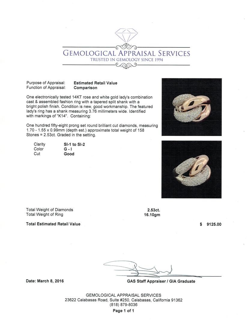 One electronically tested 14KT rose and white gold lady's combination cast & assembled fashion ring with a tapered split shank with a bright polish finish. The featured lady's ring has a shank measuring 3.76 millimeters wide. Identified with markings of "K14". Condition is new, good workmanship. Containing: One Hundred Fifty-Eight prong set round brilliant cut diamonds, measuring 1.70 - 1.55 x 0.99mm (depth est.) approximate total weight of 158 Stones = 2.53ct. Graded in the setting. Clarity: SI-1 to SI-2. Color: G - I. Cut Good. Total Weight of Diamonds 2.53ct. Total Weight of Ring 16.10gm. GAS Appraised at $9,125.00.