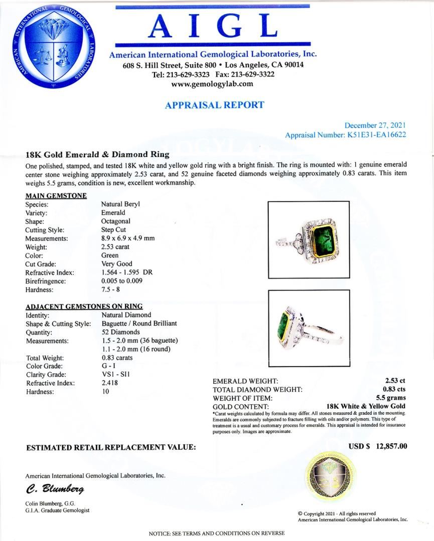 One polished, stamped, and tested 18K white and yellow gold ring with a bright finish. The ring is mounted with: 1 genuine emerald center stone weighing approximately 2.53 carat, and 52 genuine faceted diamonds weighing approximately 0.83 carats. This ite