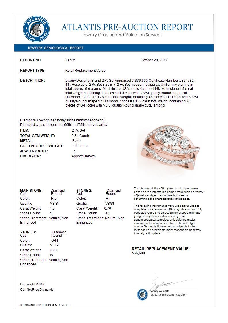 REF-609H6A -31782 ---- 2.54 CTW Certified VS/SI Diamond Bypass Solitaire 2Pc Wedding Set 14K Rose Gold ---- Luxury Designer Brand 2 Pc Set Appraised at $36,600 Certificate Number US31782 14k Rose gold, 2 Pc Set Size is 7, 2 Pc Set measuring approx. Uniform, weighing in total approx. 9.6 grams. Made in the USA and is stamped 14k, Main stone 1.5 carat total weight containing 1 pieces of H-J color with VS/SI quality Round shape cut Diamond , Stone #2 0.76 carat total weight containing 46 pieces of H-I color with VS/SI quality Round shape cut Diamond , Stone #3 0.28 carat total weight containing 36 pieces of G-H color with VS/SI quality Round shape cut Diamond