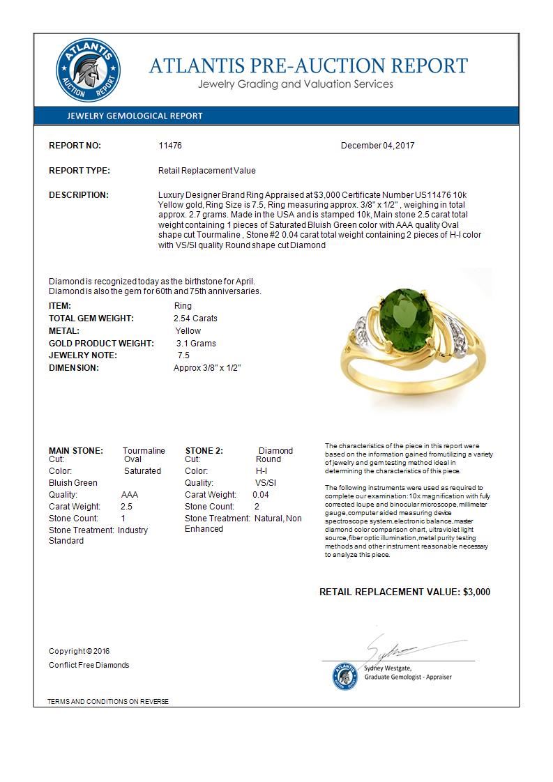 11476 - REF-39Y3X ---- 2.54 CTW Green Tourmaline & Diamond Ring 10K Yellow Gold ---- Luxury Designer Brand Ring Appraised at $3,000 Certificate Number US11476 10k Yellow gold, Ring Size is 7.5, Ring measuring approx. 3/8" x 1/2" , weighing in total approx. 2.7 grams. Made in the USA and is stamped 10k, Main stone 2.5 carat total weight containing 1 pieces of Saturated Bluish Green color with AAA quality Oval shape cut Tourmaline , Stone #2 0.04 carat total weight containing 2 pieces of H-I color with VS/SI quality Round shape cut Diamond