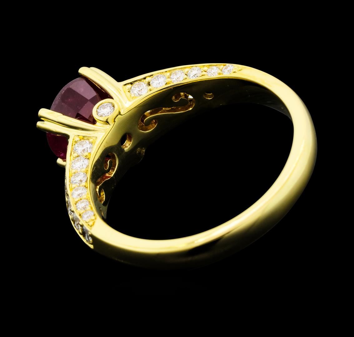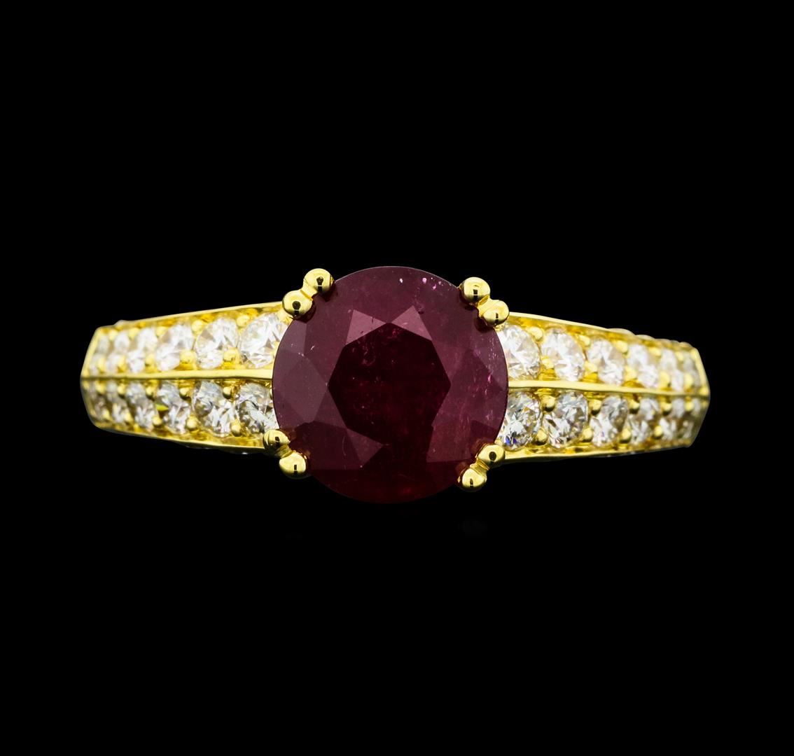 One electronically tested 18KT yellow gold lady's cast fashion ring with a tapered cathedral shank with a bright polish finish. The featured lady's ring has a shank measuring 2.57 millimeters wide. Identified with markings of '18K'. Condition is new, good workmanship. Containing: One prong set round modified mixed cut natural ruby, measuring 7.50 - 7.42 x 5.17 mm, (depth est.) approximate weight of 2.54ct., clarity is heavily included, medium dark, moderately strong, red color, (GIA R 6/4), cut is good. Transmitting light somewhat diffusely, semi-transparent to translucent. Naturally occurring internal & external characteristics are present. Indications of laboratory high temperature heat treatment, with glass & flux additives. Colored gemstones are presumed to have been subjected to commonly used enhancement processes. Graded in the setting. Thirty prong set round brilliant cut diamonds, measuring 2.00 - 1.60 x 1.12mm (depth est.) approximate total weight of 30 Stones = 0.67ct. Graded in the setting. Color G - H Clarity VS-1 to VS-2 Cut Very Good Twenty prong set round brilliant cut diamonds, measuring 1.50 - 1.10 x 0.81mm (depth est.) approximate total weight of 20 Stones = 0.18ct. Graded in the setting. Color G - H Clarity VS-1 to VS-2 Cut Very Good. Total Weight of Colored Stones 2.54ct.. Total Weight of Diamonds 0.85ct.. Total Weight of Ring 5.50gm. GAS Appraised.
