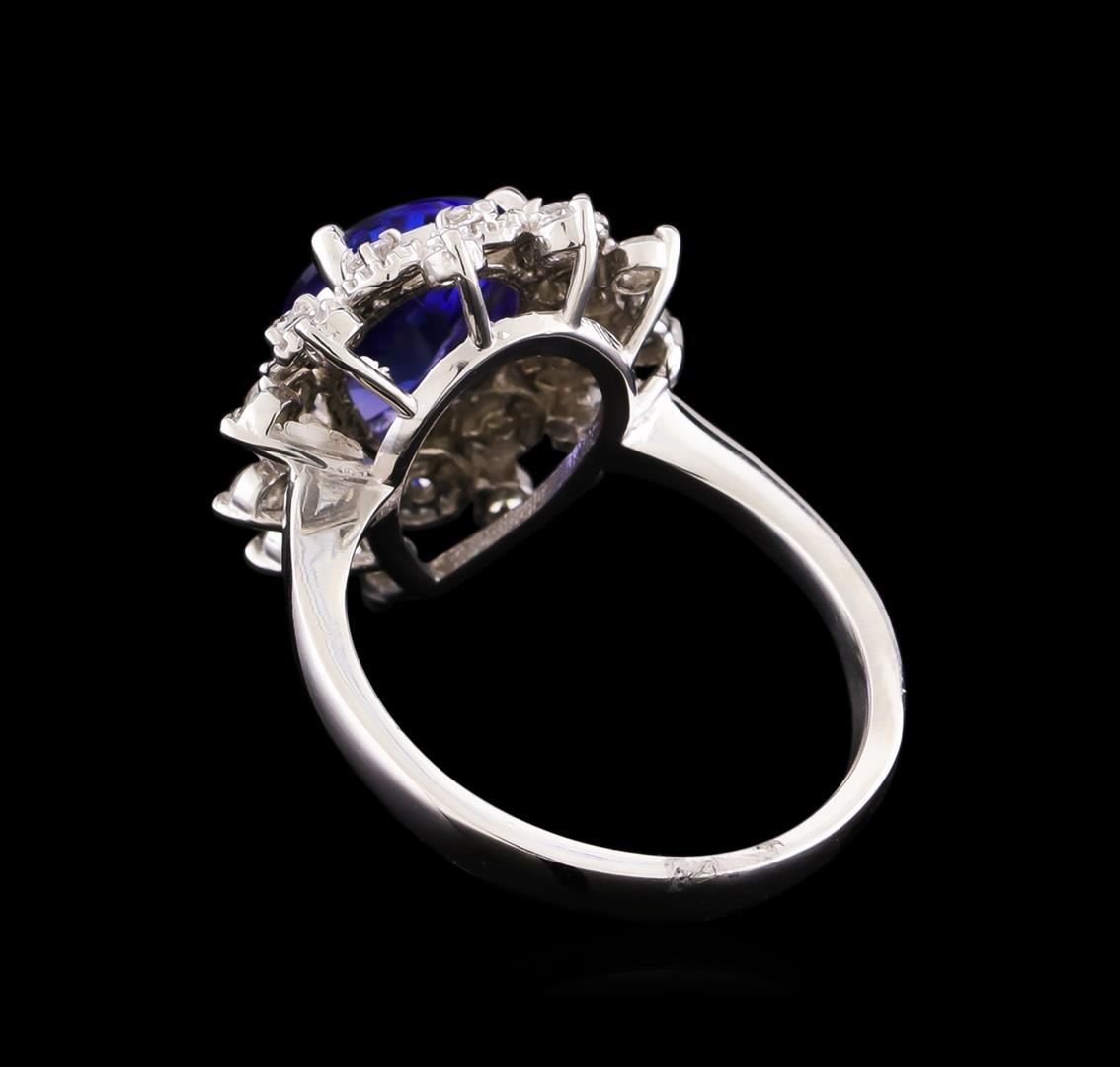 One electronically tested 14KT white gold lady's cast fashion ring with a double halo with a bright polish with milgrain detailing finish. The featured lady's ring has a shank measuring 2.47 millimeters wide. Identified with markings of "K14". Condition is new, good workmanship. Containing: One prong set pear modified brilliant cut natural tanzanite, measuring 11.31 x 8.08 x 4.39mm, approximate weight of 2.54ct., clarity is eye clean, medium, moderately strong, violetish blue color, (GIA vB 5/4), cut is very good. Transmitting light with no distortion, transparent. Colored gemstones are presumed to have been subjected to commonly used enhancement processes. Graded in the setting. Eleven prong set round brilliant cut diamonds, measuring 2.00 - 1.90 x 1.17mm (depth est.) approximate total weight of 11 Stones = 0.30ct. Graded in the setting. Clarity: SI-1 to SI-2. Color: H - I. Cut Good Eleven prong set round brilliant cut diamonds, measuring 1.70 - 1.65 x 1.04mm (depth est.) approximate total weight of 11 Stones = 0.20ct. Graded in the setting. Clarity: SI-1 to I-1. Color: H - I. Cut Good. Total Weight of Colored Stones 2.54ct. Total Weight of Diamonds 0.50ct. Total Weight of Ring 5.00gm. GAS Appraised at $5,580.00.
