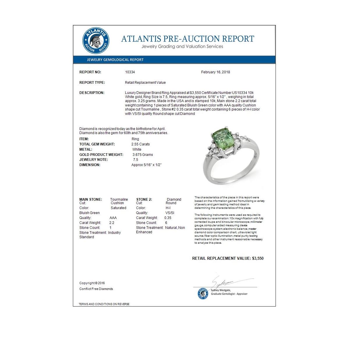 REF-45H8A -10334 ---- 2.55 CTW Green Tourmaline & Diamond Ring 10K White Gold ---- Luxury Designer Brand Ring Appraised at $3,550 Certificate Number US10334 10k White gold, Ring Size is 7.5, Ring measuring approx. 5/16" x 1/2" , weighing in total approx. 3.25 grams. Made in the USA and is stamped 10k, Main stone 2.2 carat total weight containing 1 pieces of Saturated Bluish Green color with AAA quality Cushion shape cut Tourmaline , Stone #2 0.35 carat total weight containing 6 pieces of H-I color with VS/SI quality Round shape cut Diamond