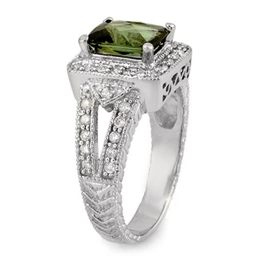 2.55 CTW Green Tourmaline & Diamond Ring 18K White Gold ---- Luxury Designer Brand Ring Appraised Retail Price at $8,950 ---- SKU Number US11334 18k White gold Ring Size is 6.5, Ring measuring approx. 3/4" x 1/4" , weighing in total approx. 7.7 grams. Made in the USA and is stamped 18k, Main stone 1.75 carat total weight containing 1 pieces of Saturated Bluish Green color with AAA quality Cushion shape cut Tourmaline , Stone #2 0.8 carat total weight containing 44 pieces of H-I color with VS/SI quality Round shape cut
