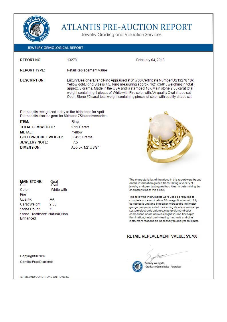 REF-25X6T -13278 ---- 2.55 CTW Opal Ring 10K Yellow Gold ---- Luxury Designer Brand Ring Appraised at $1,700 Certificate Number US13278 10k Yellow gold, Ring Size is 7.5, Ring measuring approx. 1/2" x 3/8" , weighing in total approx. 3 grams. Made in the USA and is stamped 10k, Main stone 2.55 carat total weight containing 1 pieces of White with Fire color with AA quality Oval shape cut Opal , Stone #2 carat total weight containing pieces of color with quality shape cut