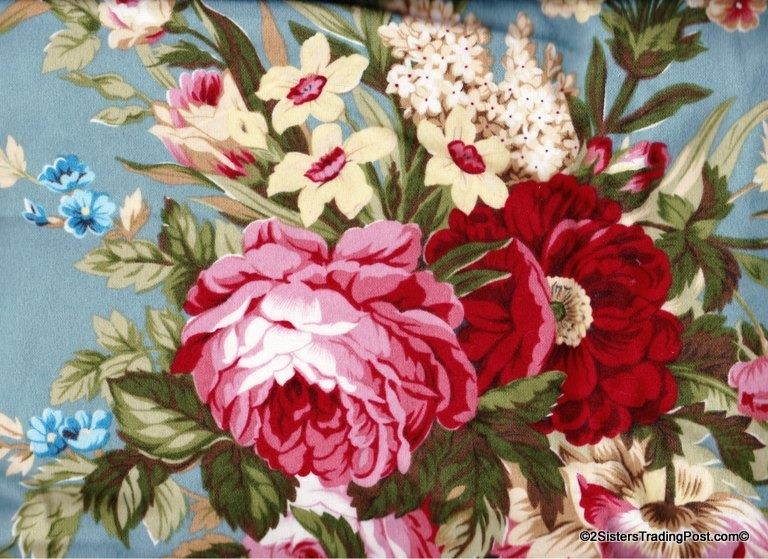 2.55 (+2~1/2) yards of Sutton Hill brushed cotton flannel by Demetria Hayward & Yuko Hasegawa for RJR Fabrics. Large floral medium blue background with large red to cream roses surrounded with pink, blue & cream colored smaller flower. 92" x 44"