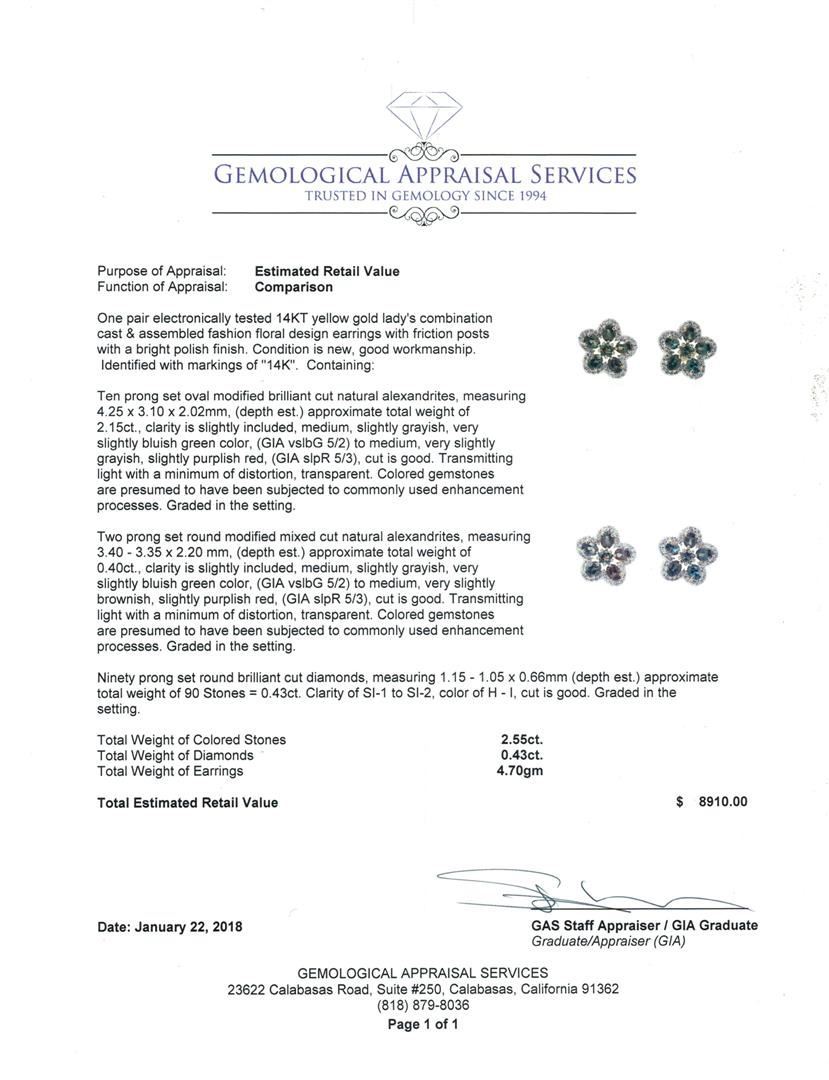 One pair electronically tested 14KT yellow gold lady's combination cast & assembled fashion floral design earrings with friction posts with a bright polish finish. Identified with markings of '14K'. Condition is new, good workmanship. Containing: Ten prong set oval modified brilliant cut natural alexandrites, measuring 4.25 x 3.10 x 2.02mm, (depth est.) approximate total weight of 2.15ct., clarity is slightly included, medium, slightly grayish, very slightly bluish green color, (GIA vslbG 5/2) to medium, very slightly grayish, slightly purplish red, (GIA slpR 5/3), cut is good. Transmitting light with a minimum of distortion, transparent. Colored gemstones are presumed to have been subjected to commonly used enhancement processes. Graded in the setting. Two prong set round modified mixed cut natural alexandrites, measuring 3.40 - 3.35 x 2.20 mm, (depth est.) approximate total weight of 0.40ct., clarity is slightly included, medium, slightly grayish, very slightly bluish green color, (GIA vslbG 5/2) to medium, very slightly brownish, slightly purplish red, (GIA slpR 5/3), cut is good. Transmitting light with a minimum of distortion, transparent. Colored gemstones are presumed to have been subjected to commonly used enhancement processes. Graded in the setting. Ninety prong set round brilliant cut diamonds, measuring 1.15 - 1.05 x 0.66mm (depth est.) approximate total weight of 90 Stones = 0.43ct. Graded in the setting. Color H - I Clarity SI-1 to SI-2 Cut Good. Total Weight of Colored Stones 2.55ct.. Total Weight of Diamonds 0.43ct.. Total Weight of Earrings 4.70gm GAS Appraised at $8910.00. GAS Appraised at $8,910.00.