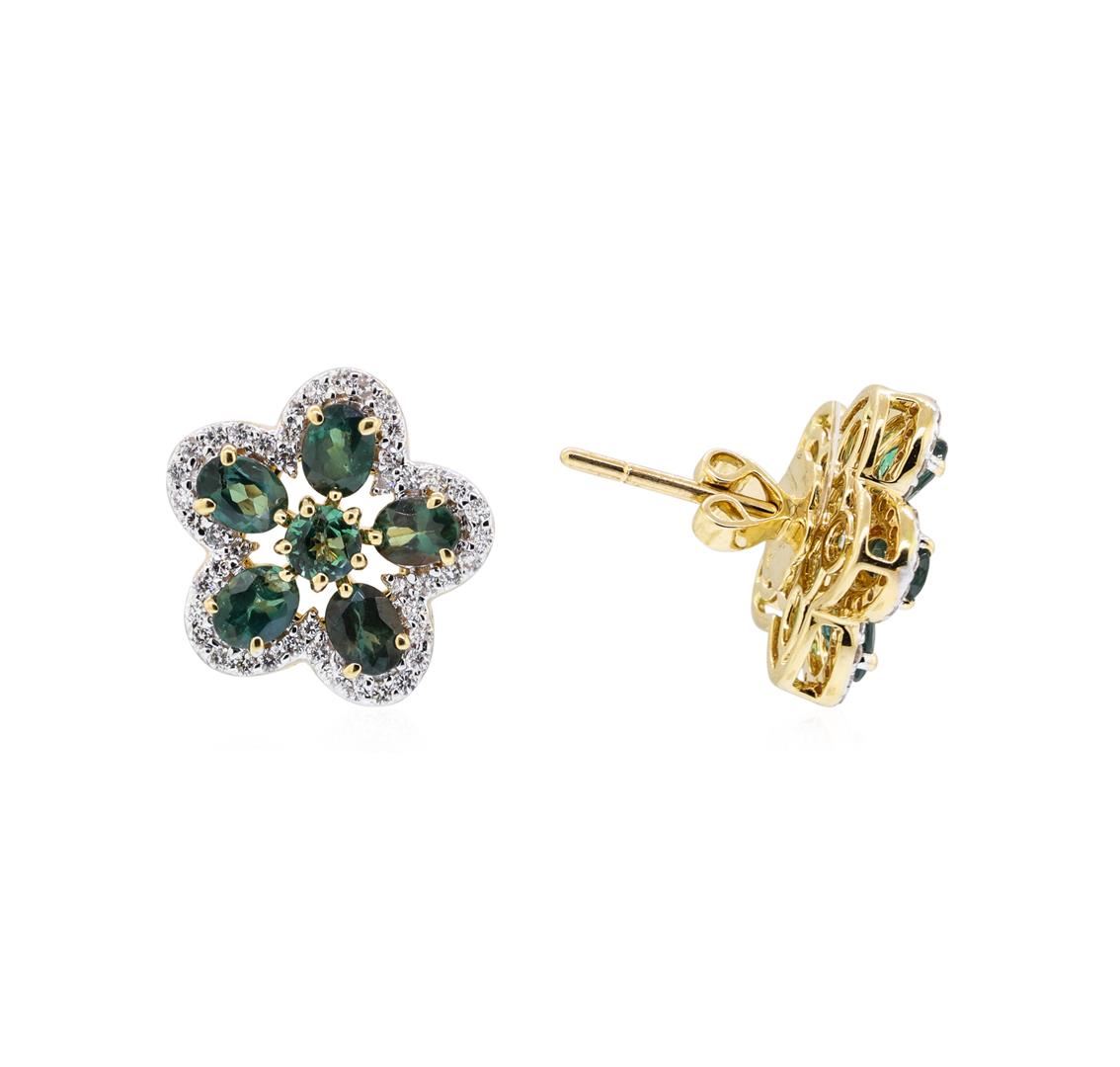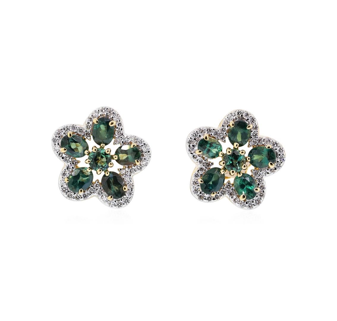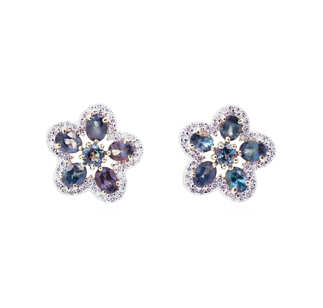 One pair electronically tested 14KT yellow gold lady's combination cast & assembled fashion floral design earrings with friction posts with a bright polish finish. Identified with markings of '14K'. Condition is new, good workmanship. Containing: Ten prong set oval modified brilliant cut natural alexandrites, measuring 4.25 x 3.10 x 2.02mm, (depth est.) approximate total weight of 2.15ct., clarity is slightly included, medium, slightly grayish, very slightly bluish green color, (GIA vslbG 5/2) to medium, very slightly grayish, slightly purplish red, (GIA slpR 5/3), cut is good. Transmitting light with a minimum of distortion, transparent. Colored gemstones are presumed to have been subjected to commonly used enhancement processes. Graded in the setting. Two prong set round modified mixed cut natural alexandrites, measuring 3.40 - 3.35 x 2.20 mm, (depth est.) approximate total weight of 0.40ct., clarity is slightly included, medium, slightly grayish, very slightly bluish green color, (GIA vslbG 5/2) to medium, very slightly brownish, slightly purplish red, (GIA slpR 5/3), cut is good. Transmitting light with a minimum of distortion, transparent. Colored gemstones are presumed to have been subjected to commonly used enhancement processes. Graded in the setting. Ninety prong set round brilliant cut diamonds, measuring 1.15 - 1.05 x 0.66mm (depth est.) approximate total weight of 90 Stones = 0.43ct. Graded in the setting. Color H - I Clarity SI-1 to SI-2 Cut Good. Total Weight of Colored Stones 2.55ct.. Total Weight of Diamonds 0.43ct.. Total Weight of Earrings 4.70gm GAS Appraised at $8910.00. GAS Appraised at $8,910.00.
