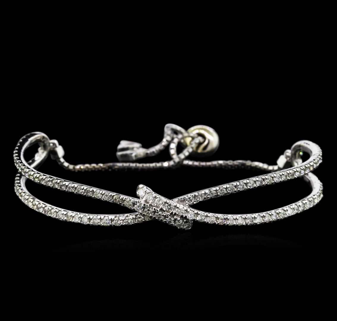 One electronically tested 14KT white gold lady's combination cast & assembled bypass crossover bangle bracelet with a bright polish finish. The featured lady's bangle bracelet has an attached, adjustable chain with bead that adds length to the bangle bracelet, which measures approximately 7 inches including the attached chain. Identified with markings of "K14". Condition is new, good workmanship. Containing: One Hundred Twenty prong set round brilliant cut diamonds, measuring 1.80 - 1.75 x 1.10mm (depth est.) approximate total weight of 120 Stones = 2.55ct. Graded in the setting. Clarity: SI-1 to I-1. Color: H - I. Cut Good. Total Weight of Diamonds 2.55ct. Total Weight of Bangle Bracelet 11.40gm. GAS Appraised at $7,745.00.