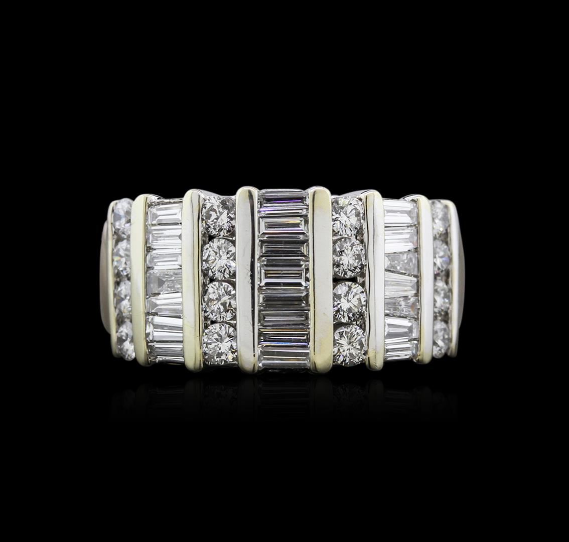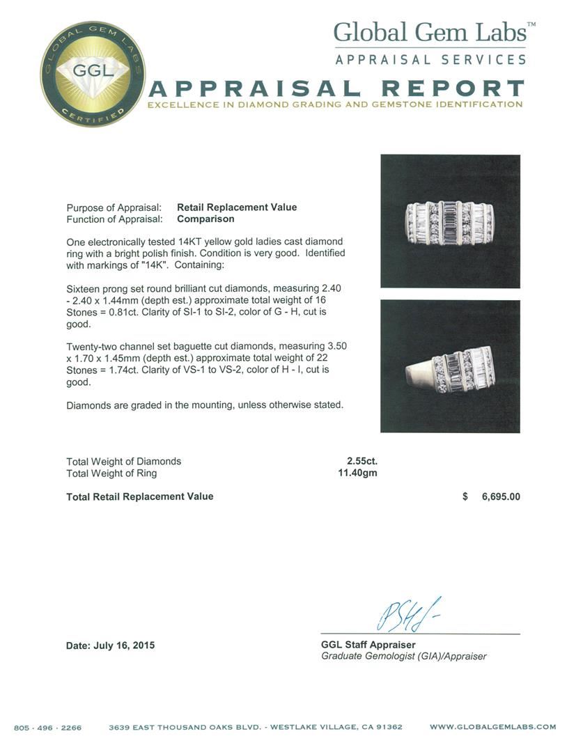 One electronically tested 14KT yellow gold ladies cast diamond ring with a bright polish finish. Identified with markings of "14K". Condition is very good. Containing: Sixteen prong set round brilliant cut diamonds, measuring 2.40 - 2.40 x 1.44mm (depth est.) approximate total weight of 16 Stones = 0.81ct. Clarity: SI-1 to SI-2. Color: G - H, Cut is Good. Twenty-Two channel set baguette cut diamonds, measuring 3.50 x 1.70 x 1.45mm (depth est.) approximate total weight of 22 Stones = 1.74ct. Clarity: VS-1 to VS-2. Color: H - I, Cut is Good. Diamonds are graded in the mounting, unless otherwise stated. Total Weight of Diamonds 2.55ct. Total Weight of Ring 11.40 grams. GGL Appraised at $6,695.00.