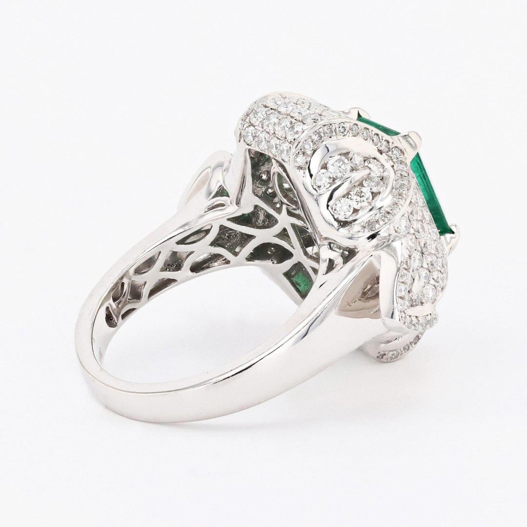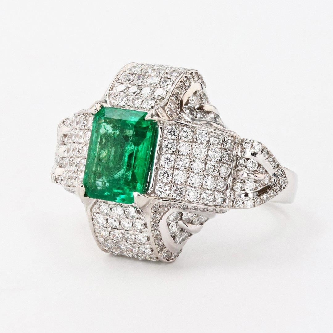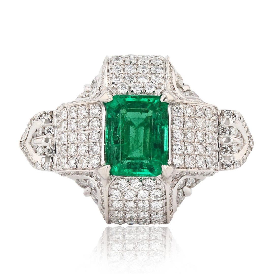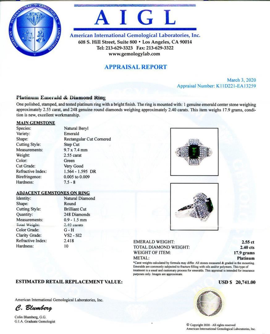 One polished, stamped, and tested platinum ring with a bright finish. The ring is mounted with: 1 genuine emerald center stone weighing approximately 2.55 carat, and 248 genuine round diamonds weighing approximately 2.40 carats. This item weighs 17.9 grams, condition is new, excellent workmanship. MAIN GEMSTONE Species: Natural Beryl Variety: Emerald Shape: Rectangular Cut Cornered Cutting Style: Step Cut Measurements: 9.7mm x 7.4mm Weight: 2.55 carat Color: Green Cut Grade: Very Good Refractive Index: 1.564 - 1.595 DR Birefringence: 0.005 to 0.009 Hardness: 7.5 - 8 ADJACENT GEMSTONES ON RING Identity: Natural Diamond Shape: Round Cutting Style: Brilliant Cut Quantity: 248 Diamonds Measurements: 0.9mm to 1.5mm Total Weight: 2.40 carats Color Grade: G - H Clarity Grade: VS2 to SI2 Refractive Index: 2.418 Hardness: 10 EMERALD WEIGHT: 2.55 ctw TOTAL DIAMOND WEIGHT: 2.40 ctw WEIGHT OF ITEM: 17.9 grams METAL: Platinum