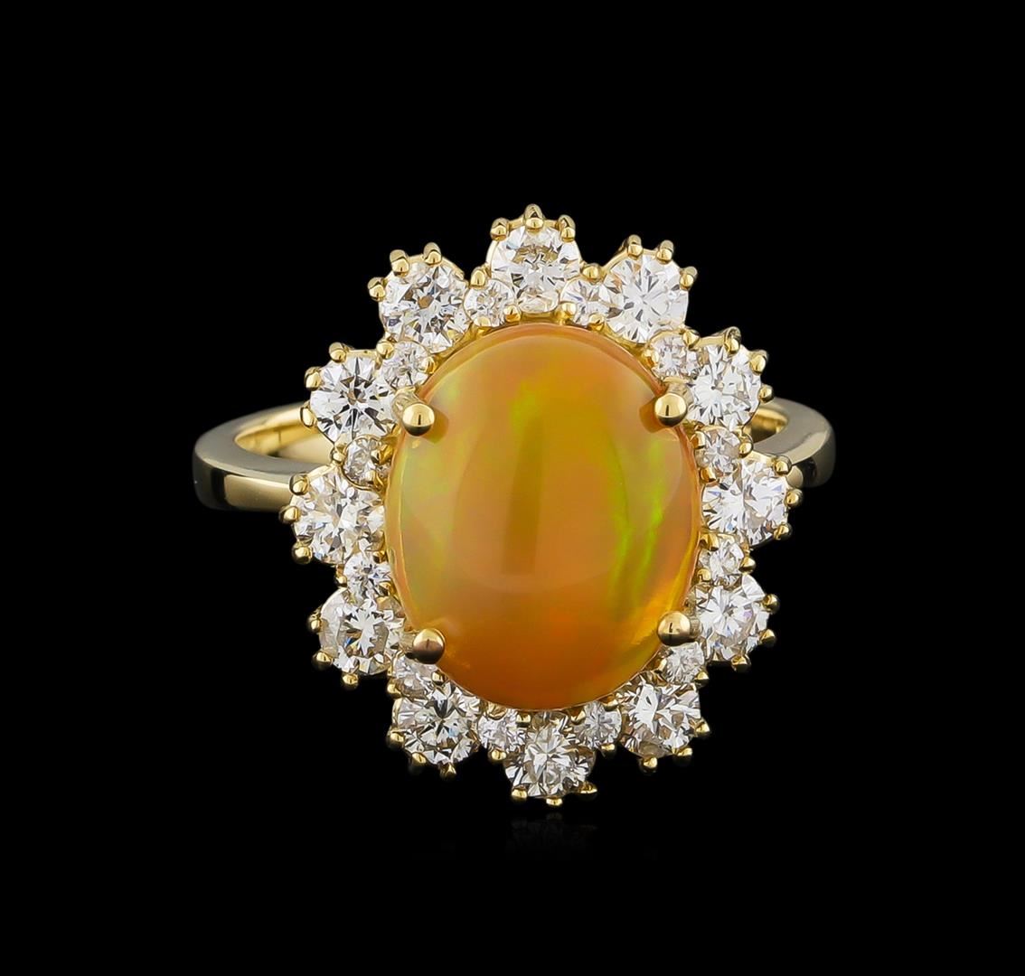 One electronically tested 14KT yellow gold lady's cast fashion ring with a double basket halo with a bright polish finish. The featured lady's ring has a shank measuring 2.61 millimeters wide. Identified with markings of "K14". Condition is new, good workmanship. Containing: One orange crystal that is cut in a oval shaped cabochon and is prong set, measuring 11.91 mm long x 9.73 mm wide, and 5.12 mm thick and the approximate weight is 2.55 carats. The opal has a somewhat bright, orange-green play of color (fire) in a rolling flashfire pattern; a medium dome; a good cut; no inclusions; consistent in its brightness and pattern; and is not directional. Graded in the setting. Twelve prong set round brilliant cut diamonds, measuring 2.90 - 2.80 x 1.71mm (depth est.) approximate total weight of 12 Stones = 1.01ct. Graded in the setting. Clarity: SI-1 to I-1. Color: G - Very Good Twelve prong set round brilliant cut diamonds, measuring 1.60 - 1.50 x 0.93mm (depth est.) approximate total weight of 12 Stones = 0.16ct. Graded in the setting. Clarity: SI-1 to I-1. Color: G - Good. Total Weight of Diamonds 1.17ct. Total Weight of Opals 2.55ct. Total Weight of Ring 5.60gm.