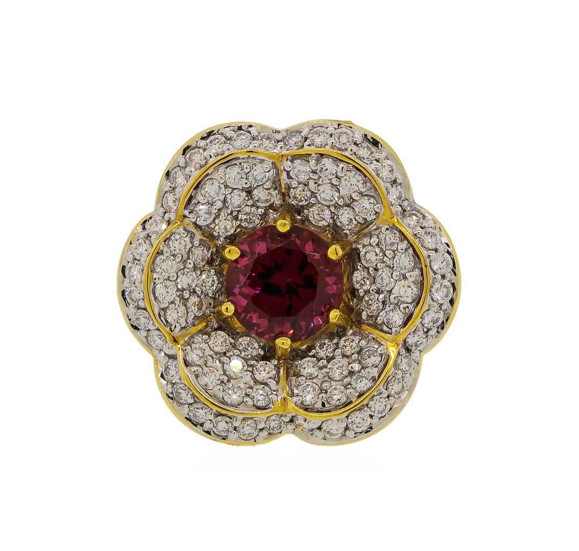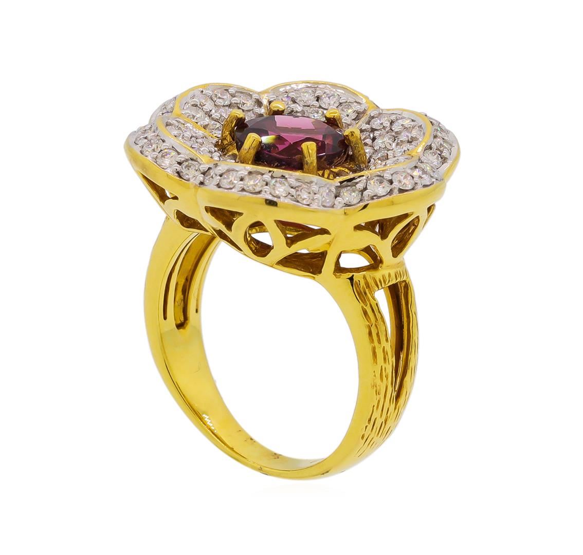 One electronically tested 18KT yellow gold lady's combination cast & assembled fashion floral design ring with a bright polish finish. The featured lady's ring has a shank measuring 2.80 millimeters wide. Identified with markings of '18K'. Condition is new, good workmanship. Containing: One prong set round modified brilliant cut natural red spinel, measuring 8.05 - 7.95 x 5.88 mm, (depth est.) approximate weight of 2.55ct., clarity is eye clean, medium dark, moderately strong, orangy red color, (GIA oR 6/4), cut is very good. Transmitting light with no distortion, transparent. Colored gemstones are presumed to have been subjected to commonly used enhancement processes. Graded in the setting. Eighty-Four prong set round brilliant cut diamonds, measuring 1.60 - 1.50 x 0.96mm (depth est.) approximate total weight of 84 Stones = 1.19ct. Graded in the setting. Clarity SI-1 to SI-2. Color: G - H Cut Good. Total Weight of Colored Stones 2.55ct.. Total Weight of Diamonds 1.19ct.. Total Weight of Ring 11.60gm. GAS Appraised at $11,760.00.
